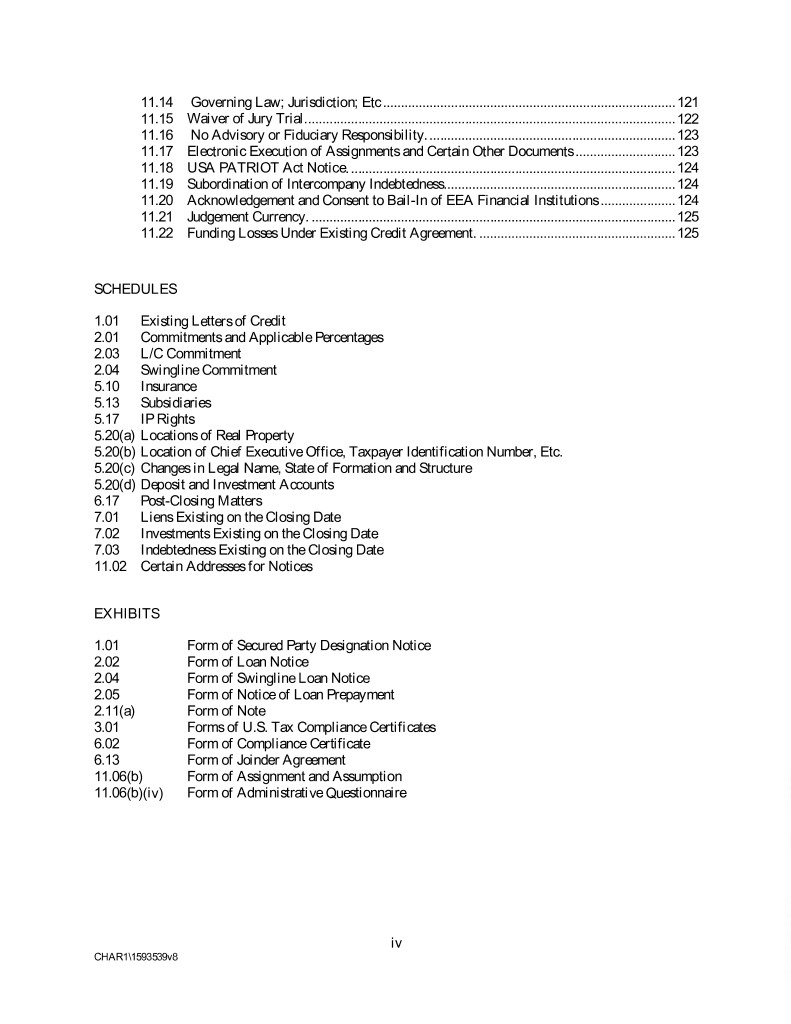 11.14 Governing Law; Jurisdiction; Etc .................................................................................. 121 11.15 Waiver of Jury Trial. ....................................................................................................... 122 11.16 No Advisory or Fiduciary Responsibility. ..................................................................... 123 11.17 Electronic Execution of Assignments and Certain Other Documents ............................ 123 11.18 USA PATRIOT Act Notice. ........................................................................................... 124 11.19 Subordination of Intercompany Indebtedness................................................................. 124 11.20 Acknowledgement and Consent to Bail-In of EEA Financial Institutions ..................... 124 11.21 Judgement Currency. ...................................................................................................... 125 11.22 Funding Losses Under Existing Credit Agreement. ....................................................... 125 SCHEDULES 1.01 Existing Letters of Credit 2.01 Commitments and Applicable Percentages 2.03 L/C Commitment 2.04 Swingline Commitment 5.10 Insurance 5.13 Subsidiaries 5.17 IP Rights 5.20(a) Locations of Real Property 5.20(b) Location of Chief Executive Office, Taxpayer Identification Number, Etc. 5.20(c) Changes in Legal Name, State of Formation and Structure 5.20(d) Deposit and Investment Accounts 6.17 Post-Closing Matters 7.01 Liens Existing on the Closing Date 7.02 Investments Existing on the Closing Date 7.03 Indebtedness Existing on the Closing Date 11.02 Certain Addresses for Notices EXHIBITS 1.01 Form of Secured Party Designation Notice 2.02 Form of Loan Notice 2.04 Form of Swingline Loan Notice 2.05 Form of Notice of Loan Prepayment 2.11(a) Form of Note 3.01 Forms of U.S. Tax Compliance Certificates 6.02 Form of Compliance Certificate 6.13 Form of Joinder Agreement 11.06(b) Form of Assignment and Assumption 11.06(b)(iv) Form of Administrative Questionnaire iv CHAR1\1593539v8