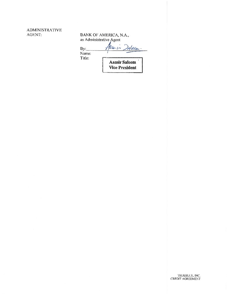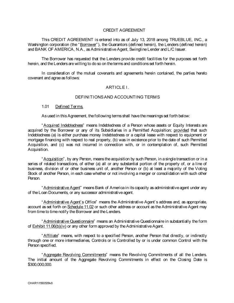 CREDIT AGREEMENT This CREDIT AGREEMENT is entered into as of July 13, 2018 among TRUEBLUE, INC., a Washington corporation (the “Borrower”), the Guarantors (defined herein), the Lenders (defined herein) and BANK OF AMERICA, N.A., as Administrative Agent, Swingline Lender and L/C Issuer. The Borrower has requested that the Lenders provide credit facilities for the purposes set forth herein, and the Lenders are willing to do so on the terms and conditions set forth herein. In consideration of the mutual covenants and agreements herein contained, the parties hereto covenant and agree as follows: ARTICLE I. DEFINITIONS AND ACCOUNTING TERMS 1.01 Defined Terms. As used in this Agreement, the following terms shall have the meanings set forth below: “Acquired Indebtedness” means Indebtedness of a Person whose assets or Equity Interests are acquired by the Borrower or any of its Subsidiaries in a Permitted Acquisition; provided that such Indebtedness (a) is either purchase money Indebtedness or a capital lease with respect to equipment or mortgage financing with respect to real property, (b) was in existence prior to the date of such Permitted Acquisition, and (c) was not incurred in connection with, or in contemplation of, such Permitted Acquisition. “Acquisition”, by any Person, means the acquisition by such Person, in a single transaction or in a series of related transactions, of either (a) all or any substantial portion of the property of, or a line of business, division of or other business unit of, another Person or (b) at least a majority of the Voting Stock of another Person, in each case whether or not involving a merger or consolidation with such other Person. “Administrative Agent” means Bank of America in its capacity as administrative agent under any of the Loan Documents, or any successor administrative agent. “Administrative Agent’s Office” means the Administrative Agent’s address and, as appropriate, account as set forth on Schedule 11.02 or such other address or account as the Administrative Agent may from time to time notify the Borrower and the Lenders. “Administrative Questionnaire” means an Administrative Questionnaire in substantially the form of Exhibit 11.06(b)(iv) or any other form approved by the Administrative Agent. “Affiliate” means, with respect to a specified Person, another Person that directly, or indirectly through one or more intermediaries, Controls or is Controlled by or is under common Control with the Person specified. “Aggregate Revolving Commitments” means the Revolving Commitments of all the Lenders. The initial amount of the Aggregate Revolving Commitments in effect on the Closing Date is $300,000,000. CHAR1\1593539v8