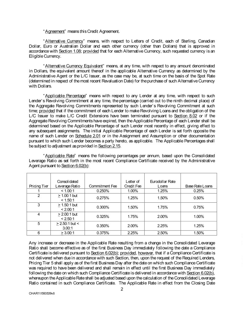 “Agreement” means this Credit Agreement. “Alternative Currency” means, with respect to Letters of Credit, each of Sterling, Canadian Dollar, Euro or Australian Dollar and each other currency (other than Dollars) that is approved in accordance with Section 1.08; provided that for each Alternative Currency, such requested currency is an Eligible Currency. “Alternative Currency Equivalent” means, at any time, with respect to any amount denominated in Dollars, the equivalent amount thereof in the applicable Alternative Currency as determined by the Administrative Agent or the L/C Issuer, as the case may be, at such time on the basis of the Spot Rate (determined in respect of the most recent Revaluation Date) for the purchase of such Alternative Currency with Dollars. “Applicable Percentage” means with respect to any Lender at any time, with respect to such Lender’s Revolving Commitment at any time, the percentage (carried out to the ninth decimal place) of the Aggregate Revolving Commitments represented by such Lender’s Revolving Commitment at such time; provided that if the commitment of each Lender to make Revolving Loans and the obligation of the L/C Issuer to make L/C Credit Extensions have been terminated pursuant to Section 8.02 or if the Aggregate Revolving Commitments have expired, then the Applicable Percentage of each Lender shall be determined based on the Applicable Percentage of such Lender most recently in effect, giving effect to any subsequent assignments. The initial Applicable Percentage of each Lender is set forth opposite the name of such Lender on Schedule 2.01 or in the Assignment and Assumption or other documentation pursuant to which such Lender becomes a party hereto, as applicable. The Applicable Percentages shall be subject to adjustment as provided in Section 2.15. “Applicable Rate” means the following percentages per annum, based upon the Consolidated Leverage Ratio as set forth in the most recent Compliance Certificate received by the Administrative Agent pursuant to Section 6.02(b): Consolidated Letter of Eurodollar Rate Pricing Tier Leverage Ratio Commitment Fee Credit Fee Loans Base Rate Loans 1 < 1.00:1 0.250% 1.00% 1.25% 0.25% 2 > 1.00:1 but 0.275% 1.25% 1.50% 0.50% < 1.50:1 3 > 1.50:1 but 0.300% 1.50% 1.75% 0.75% < 2.00:1 4 > 2.00:1 but 0.325% 1.75% 2.00% 1.00% < 2.50:1 5 > 2.50:1 but < 0.350% 2.00% 2.25% 1.25% 3.00:1 6 > 3.00:1 0.375% 2.25% 2.50% 1.50% Any increase or decrease in the Applicable Rate resulting from a change in the Consolidated Leverage Ratio shall become effective as of the first Business Day immediately following the date a Compliance Certificate is delivered pursuant to Section 6.02(b); provided, however, that if a Compliance Certificate is not delivered when due in accordance with such Section, then, upon the request of the Required Lenders, Pricing Tier 5 shall apply as of the first Business Day after the date on which such Compliance Certificate was required to have been delivered and shall remain in effect until the first Business Day immediately following the date on which such Compliance Certificate is delivered in accordance with Section 6.02(b), whereupon the Applicable Rate shall be adjusted based upon the calculation of the Consolidated Leverage Ratio contained in such Compliance Certificate. The Applicable Rate in effect from the Closing Date 2 CHAR1\1593539v8