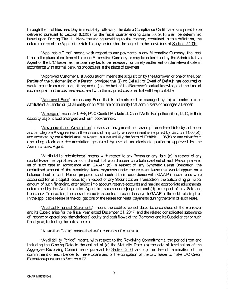 through the first Business Day immediately following the date a Compliance Certificate is required to be delivered pursuant to Section 6.02(b) for the fiscal quarter ending June 30, 2018 shall be determined based upon Pricing Tier 1. Notwithstanding anything to the contrary contained in this definition, the determination of the Applicable Rate for any period shall be subject to the provisions of Section 2.10(b). “Applicable Time” means, with respect to any payments in any Alternative Currency, the local time in the place of settlement for such Alternative Currency as may be determined by the Administrative Agent or the L/C Issuer, as the case may be, to be necessary for timely settlement on the relevant date in accordance with normal banking procedures in the place of payment. “Approved Customer List Acquisition” means the acquisition by the Borrower or one of the Loan Parties of the customer list of a Person, provided that (i) no Default or Event of Default has occurred or would result from such acquisition; and (ii) to the best of the Borrower’s actual knowledge at the time of such acquisition the business associated with the acquired customer list will be profitable. “Approved Fund” means any Fund that is administered or managed by (a) a Lender, (b) an Affiliate of a Lender or (c) an entity or an Affiliate of an entity that administers or manages a Lender. “Arrangers” means MLPFS, PNC Capital Markets LLC and Wells Fargo Securities, LLC, in their capacity as joint lead arrangers and joint bookrunners. “Assignment and Assumption” means an assignment and assumption entered into by a Lender and an Eligible Assignee (with the consent of any party whose consent is required by Section 11.06(b)), and accepted by the Administrative Agent, in substantially the form of Exhibit 11.06(b) or any other form (including electronic documentation generated by use of an electronic platform) approved by the Administrative Agent. “Attributable Indebtedness” means, with respect to any Person on any date, (a) in respect of any capital lease, the capitalized amount thereof that would appear on a balance sheet of such Person prepared as of such date in accordance with GAAP, (b) in respect of any Synthetic Lease Obligation, the capitalized amount of the remaining lease payments under the relevant lease that would appear on a balance sheet of such Person prepared as of such date in accordance with GAAP if such lease were accounted for as a capital lease, (c) in respect of any Securitization Transaction, the outstanding principal amount of such financing, after taking into account reserve accounts and making appropriate adjustments, determined by the Administrative Agent in its reasonable judgment and (d) in respect of any Sale and Leaseback Transaction, the present value (discounted in accordance with GAAP at the debt rate implied in the applicable lease) of the obligations of the lessee for rental payments during the term of such lease. “Audited Financial Statements” means the audited consolidated balance sheet of the Borrower and its Subsidiaries for the fiscal year ended December 31, 2017, and the related consolidated statements of income or operations, shareholders’ equity and cash flows of the Borrower and its Subsidiaries for such fiscal year, including the notes thereto. “Australian Dollar” means the lawful currency of Australia. “Availability Period” means, with respect to the Revolving Commitments, the period from and including the Closing Date to the earliest of (a) the Maturity Date, (b) the date of termination of the Aggregate Revolving Commitments pursuant to Section 2.06, and (c) the date of termination of the commitment of each Lender to make Loans and of the obligation of the L/C Issuer to make L/C Credit Extensions pursuant to Section 8.02. 3 CHAR1\1593539v8