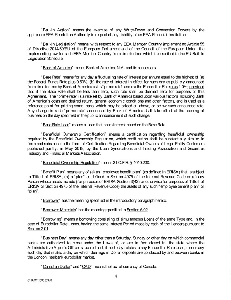 “Bail-In Action” means the exercise of any Write-Down and Conversion Powers by the applicable EEA Resolution Authority in respect of any liability of an EEA Financial Institution. “Bail-In Legislation” means, with respect to any EEA Member Country implementing Article 55 of Directive 2014/59/EU of the European Parliament and of the Council of the European Union, the implementing law for such EEA Member Country from time to time which is described in the EU Bail-In Legislation Schedule. “Bank of America” means Bank of America, N.A. and its successors. “Base Rate” means for any day a fluctuating rate of interest per annum equal to the highest of (a) the Federal Funds Rate plus 0.50%, (b) the rate of interest in effect for such day as publicly announced from time to time by Bank of America as its “prime rate” and (c) the Eurodollar Rate plus 1.0%; provided that if the Base Rate shall be less than zero, such rate shall be deemed zero for purposes of this Agreement. The “prime rate” is a rate set by Bank of America based upon various factors including Bank of America’s costs and desired return, general economic conditions and other factors, and is used as a reference point for pricing some loans, which may be priced at, above, or below such announced rate. Any change in such “prime rate” announced by Bank of America shall take effect at the opening of business on the day specified in the public announcement of such change. “Base Rate Loan” means a Loan that bears interest based on the Base Rate. “Beneficial Ownership Certification” means a certification regarding beneficial ownership required by the Beneficial Ownership Regulation, which certification shall be substantially similar in form and substance to the form of Certification Regarding Beneficial Owners of Legal Entity Customers published jointly, in May 2018, by the Loan Syndications and Trading Association and Securities Industry and Financial Markets Association. “Beneficial Ownership Regulation” means 31 C.F.R. § 1010.230. “Benefit Plan” means any of (a) an “employee benefit plan” (as defined in ERISA) that is subject to Title I of ERISA, (b) a “plan” as defined in Section 4975 of the Internal Revenue Code or (c) any Person whose assets include (for purposes of ERISA Section 3(42) or otherwise for purposes of Title I of ERISA or Section 4975 of the Internal Revenue Code) the assets of any such “employee benefit plan” or “plan”. “Borrower” has the meaning specified in the introductory paragraph hereto. “Borrower Materials” has the meaning specified in Section 6.02. “Borrowing” means a borrowing consisting of simultaneous Loans of the same Type and, in the case of Eurodollar Rate Loans, having the same Interest Period made by each of the Lenders pursuant to Section 2.01. “Business Day” means any day other than a Saturday, Sunday or other day on which commercial banks are authorized to close under the Laws of, or are in fact closed in, the state where the Administrative Agent’s Office is located and, if such day relates to any Eurodollar Rate Loan, means any such day that is also a day on which dealings in Dollar deposits are conducted by and between banks in the London interbank eurodollar market. “Canadian Dollar” and “CAD” means the lawful currency of Canada. 4 CHAR1\1593539v8