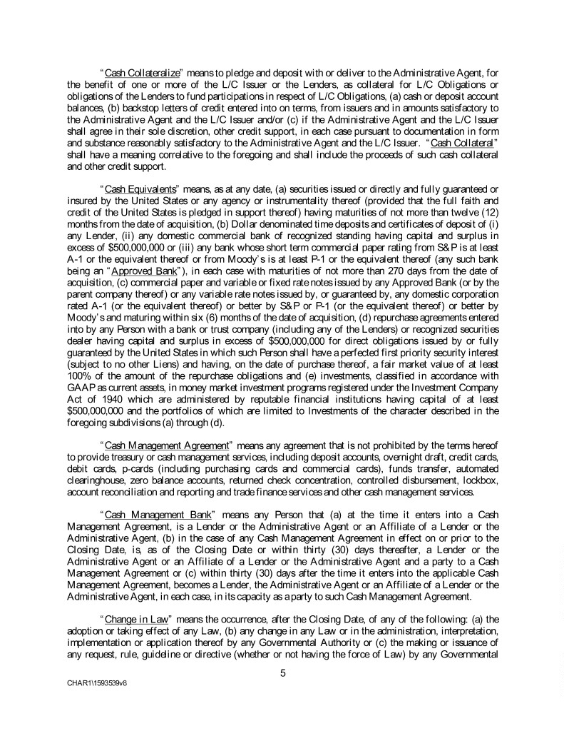 “Cash Collateralize” means to pledge and deposit with or deliver to the Administrative Agent, for the benefit of one or more of the L/C Issuer or the Lenders, as collateral for L/C Obligations or obligations of the Lenders to fund participations in respect of L/C Obligations, (a) cash or deposit account balances, (b) backstop letters of credit entered into on terms, from issuers and in amounts satisfactory to the Administrative Agent and the L/C Issuer and/or (c) if the Administrative Agent and the L/C Issuer shall agree in their sole discretion, other credit support, in each case pursuant to documentation in form and substance reasonably satisfactory to the Administrative Agent and the L/C Issuer. “Cash Collateral” shall have a meaning correlative to the foregoing and shall include the proceeds of such cash collateral and other credit support. “Cash Equivalents” means, as at any date, (a) securities issued or directly and fully guaranteed or insured by the United States or any agency or instrumentality thereof (provided that the full faith and credit of the United States is pledged in support thereof) having maturities of not more than twelve (12) months from the date of acquisition, (b) Dollar denominated time deposits and certificates of deposit of (i) any Lender, (ii) any domestic commercial bank of recognized standing having capital and surplus in excess of $500,000,000 or (iii) any bank whose short term commercial paper rating from S&P is at least A-1 or the equivalent thereof or from Moody’s is at least P-1 or the equivalent thereof (any such bank being an “Approved Bank”), in each case with maturities of not more than 270 days from the date of acquisition, (c) commercial paper and variable or fixed rate notes issued by any Approved Bank (or by the parent company thereof) or any variable rate notes issued by, or guaranteed by, any domestic corporation rated A-1 (or the equivalent thereof) or better by S&P or P-1 (or the equivalent thereof) or better by Moody’s and maturing within six (6) months of the date of acquisition, (d) repurchase agreements entered into by any Person with a bank or trust company (including any of the Lenders) or recognized securities dealer having capital and surplus in excess of $500,000,000 for direct obligations issued by or fully guaranteed by the United States in which such Person shall have a perfected first priority security interest (subject to no other Liens) and having, on the date of purchase thereof, a fair market value of at least 100% of the amount of the repurchase obligations and (e) investments, classified in accordance with GAAP as current assets, in money market investment programs registered under the Investment Company Act of 1940 which are administered by reputable financial institutions having capital of at least $500,000,000 and the portfolios of which are limited to Investments of the character described in the foregoing subdivisions (a) through (d). “Cash Management Agreement” means any agreement that is not prohibited by the terms hereof to provide treasury or cash management services, including deposit accounts, overnight draft, credit cards, debit cards, p-cards (including purchasing cards and commercial cards), funds transfer, automated clearinghouse, zero balance accounts, returned check concentration, controlled disbursement, lockbox, account reconciliation and reporting and trade finance services and other cash management services. “Cash Management Bank” means any Person that (a) at the time it enters into a Cash Management Agreement, is a Lender or the Administrative Agent or an Affiliate of a Lender or the Administrative Agent, (b) in the case of any Cash Management Agreement in effect on or prior to the Closing Date, is, as of the Closing Date or within thirty (30) days thereafter, a Lender or the Administrative Agent or an Affiliate of a Lender or the Administrative Agent and a party to a Cash Management Agreement or (c) within thirty (30) days after the time it enters into the applicable Cash Management Agreement, becomes a Lender, the Administrative Agent or an Affiliate of a Lender or the Administrative Agent, in each case, in its capacity as a party to such Cash Management Agreement. “Change in Law” means the occurrence, after the Closing Date, of any of the following: (a) the adoption or taking effect of any Law, (b) any change in any Law or in the administration, interpretation, implementation or application thereof by any Governmental Authority or (c) the making or issuance of any request, rule, guideline or directive (whether or not having the force of Law) by any Governmental 5 CHAR1\1593539v8