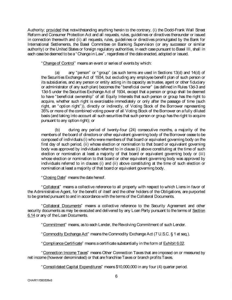 Authority; provided that notwithstanding anything herein to the contrary, (i) the Dodd-Frank Wall Street Reform and Consumer Protection Act and all requests, rules, guidelines or directives thereunder or issued in connection therewith and (ii) all requests, rules, guidelines or directives promulgated by the Bank for International Settlements, the Basel Committee on Banking Supervision (or any successor or similar authority) or the United States or foreign regulatory authorities, in each case pursuant to Basel III, shall in each case be deemed to be a “Change in Law”, regardless of the date enacted, adopted or issued. “Change of Control” means an event or series of events by which: (a) any “person” or “group” (as such terms are used in Sections 13(d) and 14(d) of the Securities Exchange Act of 1934, but excluding any employee benefit plan of such person or its subsidiaries, and any person or entity acting in its capacity as trustee, agent or other fiduciary or administrator of any such plan) becomes the “beneficial owner” (as defined in Rules 13d-3 and 13d-5 under the Securities Exchange Act of 1934, except that a person or group shall be deemed to have “beneficial ownership” of all Equity Interests that such person or group has the right to acquire, whether such right is exercisable immediately or only after the passage of time (such right, an “option right”)), directly or indirectly, of Voting Stock of the Borrower representing 35% or more of the combined voting power of all Voting Stock of the Borrower on a fully diluted basis (and taking into account all such securities that such person or group has the right to acquire pursuant to any option right); or (b) during any period of twenty-four (24) consecutive months, a majority of the members of the board of directors or other equivalent governing body of the Borrower cease to be composed of individuals (i) who were members of that board or equivalent governing body on the first day of such period, (ii) whose election or nomination to that board or equivalent governing body was approved by individuals referred to in clause (i) above constituting at the time of such election or nomination at least a majority of that board or equivalent governing body or (iii) whose election or nomination to that board or other equivalent governing body was approved by individuals referred to in clauses (i) and (ii) above constituting at the time of such election or nomination at least a majority of that board or equivalent governing body. “Closing Date” means the date hereof. “Collateral” means a collective reference to all property with respect to which Liens in favor of the Administrative Agent, for the benefit of itself and the other holders of the Obligations, are purported to be granted pursuant to and in accordance with the terms of the Collateral Documents. “Collateral Documents” means a collective reference to the Security Agreement and other security documents as may be executed and delivered by any Loan Party pursuant to the terms of Section 6.14 or any of the Loan Documents. “Commitment” means, as to each Lender, the Revolving Commitment of such Lender. “Commodity Exchange Act” means the Commodity Exchange Act (7 U.S.C. § 1 et seq.). “Compliance Certificate” means a certificate substantially in the form of Exhibit 6.02. “Connection Income Taxes” means Other Connection Taxes that are imposed on or measured by net income (however denominated) or that are franchise Taxes or branch profits Taxes. “Consolidated Capital Expenditures” means $10,000,000 in any four (4) quarter period. 6 CHAR1\1593539v8