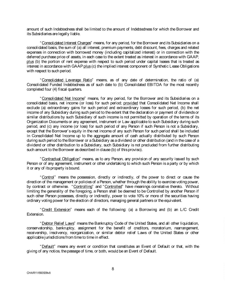 amount of such Indebtedness shall be limited to the amount of Indebtedness for which the Borrower and its Subsidiaries are legally liable. “Consolidated Interest Charges” means, for any period, for the Borrower and its Subsidiaries on a consolidated basis, the sum of (a) all interest, premium payments, debt discount, fees, charges and related expenses in connection with borrowed money (including capitalized interest) or in connection with the deferred purchase price of assets, in each case to the extent treated as interest in accordance with GAAP, plus (b) the portion of rent expense with respect to such period under capital leases that is treated as interest in accordance with GAAP plus (c) the implied interest component of Synthetic Lease Obligations with respect to such period. “Consolidated Leverage Ratio” means, as of any date of determination, the ratio of (a) Consolidated Funded Indebtedness as of such date to (b) Consolidated EBITDA for the most recently completed four (4) fiscal quarters. “Consolidated Net Income” means, for any period, for the Borrower and its Subsidiaries on a consolidated basis, net income (or loss) for such period; provided that Consolidated Net Income shall exclude (a) extraordinary gains for such period and extraordinary losses for such period, (b) the net income of any Subsidiary during such period to the extent that the declaration or payment of dividends or similar distributions by such Subsidiary of such income is not permitted by operation of the terms of its Organization Documents or any agreement, instrument or Law applicable to such Subsidiary during such period, and (c) any income (or loss) for such period of any Person if such Person is not a Subsidiary, except that the Borrower’s equity in the net income of any such Person for such period shall be included in Consolidated Net Income up to the aggregate amount of cash actually distributed by such Person during such period to the Borrower or a Subsidiary as a dividend or other distribution (and in the case of a dividend or other distribution to a Subsidiary, such Subsidiary is not precluded from further distributing such amount to the Borrower as described in clause (b) of this proviso). “Contractual Obligation” means, as to any Person, any provision of any security issued by such Person or of any agreement, instrument or other undertaking to which such Person is a party or by which it or any of its property is bound. “Control” means the possession, directly or indirectly, of the power to direct or cause the direction of the management or policies of a Person, whether through the ability to exercise voting power, by contract or otherwise. “Controlling” and “Controlled” have meanings correlative thereto. Without limiting the generality of the foregoing, a Person shall be deemed to be Controlled by another Person if such other Person possesses, directly or indirectly, power to vote 10% or more of the securities having ordinary voting power for the election of directors, managing general partners or the equivalent. “Credit Extension” means each of the following: (a) a Borrowing and (b) an L/C Credit Extension. “Debtor Relief Laws” means the Bankruptcy Code of the United States, and all other liquidation, conservatorship, bankruptcy, assignment for the benefit of creditors, moratorium, rearrangement, receivership, insolvency, reorganization, or similar debtor relief Laws of the United States or other applicable jurisdictions from time to time in effect. “Default” means any event or condition that constitutes an Event of Default or that, with the giving of any notice, the passage of time, or both, would be an Event of Default. 8 CHAR1\1593539v8