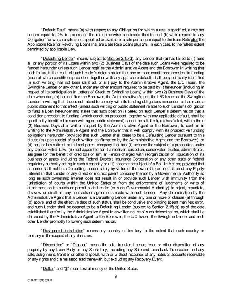 “Default Rate” means (a) with respect to any Obligation for which a rate is specified, a rate per annum equal to 2% in excess of the rate otherwise applicable thereto and (b) with respect to any Obligation for which a rate is not specified or available, a rate per annum equal to the Base Rate plus the Applicable Rate for Revolving Loans that are Base Rate Loans plus 2%, in each case, to the fullest extent permitted by applicable Law. “Defaulting Lender” means, subject to Section 2.15(d), any Lender that (a) has failed to (i) fund all or any portion of its Loans within two (2) Business Days of the date such Loans were required to be funded hereunder unless such Lender notifies the Administrative Agent and the Borrower in writing that such failure is the result of such Lender’s determination that one or more conditions precedent to funding (each of which conditions precedent, together with any applicable default, shall be specifically identified in such writing) has not been satisfied, or (ii) pay to the Administrative Agent, the L/C Issuer, the Swingline Lender or any other Lender any other amount required to be paid by it hereunder (including in respect of its participation in Letters of Credit or Swingline Loans) within two (2) Business Days of the date when due, (b) has notified the Borrower, the Administrative Agent, the L/C Issuer or the Swingline Lender in writing that it does not intend to comply with its funding obligations hereunder, or has made a public statement to that effect (unless such writing or public statement relates to such Lender’s obligation to fund a Loan hereunder and states that such position is based on such Lender’s determination that a condition precedent to funding (which condition precedent, together with any applicable default, shall be specifically identified in such writing or public statement) cannot be satisfied), (c) has failed, within three (3) Business Days after written request by the Administrative Agent or the Borrower, to confirm in writing to the Administrative Agent and the Borrower that it will comply with its prospective funding obligations hereunder (provided that such Lender shall cease to be a Defaulting Lender pursuant to this clause (c) upon receipt of such written confirmation by the Administrative Agent and the Borrower), or (d) has, or has a direct or indirect parent company that has, (i) become the subject of a proceeding under any Debtor Relief Law, (ii) had appointed for it a receiver, custodian, conservator, trustee, administrator, assignee for the benefit of creditors or similar Person charged with reorganization or liquidation of its business or assets, including the Federal Deposit Insurance Corporation or any other state or federal regulatory authority acting in such a capacity or (iii) become the subject of a Bail-In Action; provided that a Lender shall not be a Defaulting Lender solely by virtue of the ownership or acquisition of any Equity Interest in that Lender or any direct or indirect parent company thereof by a Governmental Authority so long as such ownership interest does not result in or provide such Lender with immunity from the jurisdiction of courts within the United States or from the enforcement of judgments or writs of attachment on its assets or permit such Lender (or such Governmental Authority) to reject, repudiate, disavow or disaffirm any contracts or agreements made with such Lender. Any determination by the Administrative Agent that a Lender is a Defaulting Lender under any one or more of clauses (a) through (d) above, and of the effective date of such status, shall be conclusive and binding absent manifest error, and such Lender shall be deemed to be a Defaulting Lender (subject to Section 2.15(d)) as of the date established therefor by the Administrative Agent in a written notice of such determination, which shall be delivered by the Administrative Agent to the Borrower, the L/C Issuer, the Swingline Lender and each other Lender promptly following such determination. “Designated Jurisdiction” means any country or territory to the extent that such country or territory is the subject of any Sanction. “Disposition” or “Dispose” means the sale, transfer, license, lease or other disposition of any property by any Loan Party or any Subsidiary, including any Sale and Leaseback Transaction and any sale, assignment, transfer or other disposal, with or without recourse, of any notes or accounts receivable or any rights and claims associated therewith, but excluding any Recovery Event. “Dollar” and “$” mean lawful money of the United States. 9 CHAR1\1593539v8