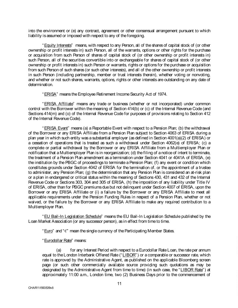 into the environment or (e) any contract, agreement or other consensual arrangement pursuant to which liability is assumed or imposed with respect to any of the foregoing. “Equity Interests” means, with respect to any Person, all of the shares of capital stock of (or other ownership or profit interests in) such Person, all of the warrants, options or other rights for the purchase or acquisition from such Person of shares of capital stock of (or other ownership or profit interests in) such Person, all of the securities convertible into or exchangeable for shares of capital stock of (or other ownership or profit interests in) such Person or warrants, rights or options for the purchase or acquisition from such Person of such shares (or such other interests), and all of the other ownership or profit interests in such Person (including partnership, member or trust interests therein), whether voting or nonvoting, and whether or not such shares, warrants, options, rights or other interests are outstanding on any date of determination. “ERISA” means the Employee Retirement Income Security Act of 1974. “ERISA Affiliate” means any trade or business (whether or not incorporated) under common control with the Borrower within the meaning of Section 414(b) or (c) of the Internal Revenue Code (and Sections 414(m) and (o) of the Internal Revenue Code for purposes of provisions relating to Section 412 of the Internal Revenue Code). “ERISA Event” means (a) a Reportable Event with respect to a Pension Plan; (b) the withdrawal of the Borrower or any ERISA Affiliate from a Pension Plan subject to Section 4063 of ERISA during a plan year in which such entity was a substantial employer (as defined in Section 4001(a)(2) of ERISA) or a cessation of operations that is treated as such a withdrawal under Section 4062(e) of ERISA; (c) a complete or partial withdrawal by the Borrower or any ERISA Affiliate from a Multiemployer Plan or notification that a Multiemployer Plan is in reorganization; (d) the filing of a notice of intent to terminate, the treatment of a Pension Plan amendment as a termination under Section 4041 or 4041A of ERISA, (e) the institution by the PBGC of proceedings to terminate a Pension Plan; (f) any event or condition which constitutes grounds under Section 4042 of ERISA for the termination of, or the appointment of a trustee to administer, any Pension Plan; (g) the determination that any Pension Plan is considered an at-risk plan or a plan in endangered or critical status within the meaning of Sections 430, 431 and 432 of the Internal Revenue Code or Sections 303, 304 and 305 of ERISA, (h) the imposition of any liability under Title IV of ERISA, other than for PBGC premiums due but not delinquent under Section 4007 of ERISA, upon the Borrower or any ERISA Affiliate or (i) a failure by the Borrower or any ERISA Affiliate to meet all applicable requirements under the Pension Funding Rules in respect of a Pension Plan, whether or not waived, or the failure by the Borrower or any ERISA Affiliate to make any required contribution to a Multiemployer Plan. “EU Bail-In Legislation Schedule” means the EU Bail-In Legislation Schedule published by the Loan Market Association (or any successor person), as in effect from time to time. “Euro” and “€” mean the single currency of the Participating Member States. “Eurodollar Rate” means: (a) for any Interest Period with respect to a Eurodollar Rate Loan, the rate per annum equal to the London Interbank Offered Rate (“LIBOR”) or a comparable or successor rate, which rate is approved by the Administrative Agent, as published on the applicable Bloomberg screen page (or such other commercially available source providing such quotations as may be designated by the Administrative Agent from time to time) (in such case, the “LIBOR Rate”) at approximately 11:00 a.m., London time, two (2) Business Days prior to the commencement of 11 CHAR1\1593539v8