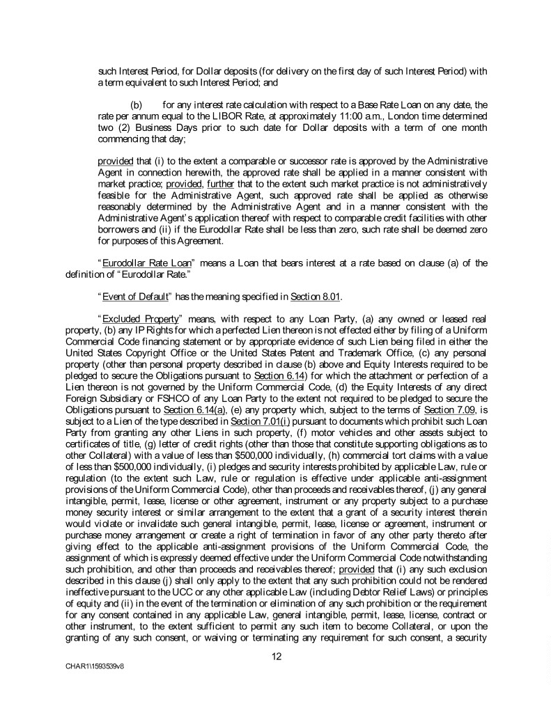 such Interest Period, for Dollar deposits (for delivery on the first day of such Interest Period) with a term equivalent to such Interest Period; and (b) for any interest rate calculation with respect to a Base Rate Loan on any date, the rate per annum equal to the LIBOR Rate, at approximately 11:00 a.m., London time determined two (2) Business Days prior to such date for Dollar deposits with a term of one month commencing that day; provided that (i) to the extent a comparable or successor rate is approved by the Administrative Agent in connection herewith, the approved rate shall be applied in a manner consistent with market practice; provided, further that to the extent such market practice is not administratively feasible for the Administrative Agent, such approved rate shall be applied as otherwise reasonably determined by the Administrative Agent and in a manner consistent with the Administrative Agent’s application thereof with respect to comparable credit facilities with other borrowers and (ii) if the Eurodollar Rate shall be less than zero, such rate shall be deemed zero for purposes of this Agreement. “Eurodollar Rate Loan” means a Loan that bears interest at a rate based on clause (a) of the definition of “Eurodollar Rate.” “Event of Default” has the meaning specified in Section 8.01. “Excluded Property” means, with respect to any Loan Party, (a) any owned or leased real property, (b) any IP Rights for which a perfected Lien thereon is not effected either by filing of a Uniform Commercial Code financing statement or by appropriate evidence of such Lien being filed in either the United States Copyright Office or the United States Patent and Trademark Office, (c) any personal property (other than personal property described in clause (b) above and Equity Interests required to be pledged to secure the Obligations pursuant to Section 6.14) for which the attachment or perfection of a Lien thereon is not governed by the Uniform Commercial Code, (d) the Equity Interests of any direct Foreign Subsidiary or FSHCO of any Loan Party to the extent not required to be pledged to secure the Obligations pursuant to Section 6.14(a), (e) any property which, subject to the terms of Section 7.09, is subject to a Lien of the type described in Section 7.01(i) pursuant to documents which prohibit such Loan Party from granting any other Liens in such property, (f) motor vehicles and other assets subject to certificates of title, (g) letter of credit rights (other than those that constitute supporting obligations as to other Collateral) with a value of less than $500,000 individually, (h) commercial tort claims with a value of less than $500,000 individually, (i) pledges and security interests prohibited by applicable Law, rule or regulation (to the extent such Law, rule or regulation is effective under applicable anti-assignment provisions of the Uniform Commercial Code), other than proceeds and receivables thereof, (j) any general intangible, permit, lease, license or other agreement, instrument or any property subject to a purchase money security interest or similar arrangement to the extent that a grant of a security interest therein would violate or invalidate such general intangible, permit, lease, license or agreement, instrument or purchase money arrangement or create a right of termination in favor of any other party thereto after giving effect to the applicable anti-assignment provisions of the Uniform Commercial Code, the assignment of which is expressly deemed effective under the Uniform Commercial Code notwithstanding such prohibition, and other than proceeds and receivables thereof; provided that (i) any such exclusion described in this clause (j) shall only apply to the extent that any such prohibition could not be rendered ineffective pursuant to the UCC or any other applicable Law (including Debtor Relief Laws) or principles of equity and (ii) in the event of the termination or elimination of any such prohibition or the requirement for any consent contained in any applicable Law, general intangible, permit, lease, license, contract or other instrument, to the extent sufficient to permit any such item to become Collateral, or upon the granting of any such consent, or waiving or terminating any requirement for such consent, a security 12 CHAR1\1593539v8