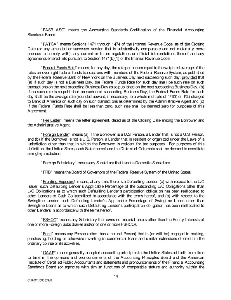 “FASB ASC” means the Accounting Standards Codification of the Financial Accounting Standards Board. “FATCA” means Sections 1471 through 1474 of the Internal Revenue Code, as of the Closing Date (or any amended or successor version that is substantively comparable and not materially more onerous to comply with), any current or future regulations or official interpretations thereof and any agreements entered into pursuant to Section 1471(b)(1) of the Internal Revenue Code. “Federal Funds Rate” means, for any day, the rate per annum equal to the weighted average of the rates on overnight federal funds transactions with members of the Federal Reserve System, as published by the Federal Reserve Bank of New York on the Business Day next succeeding such day; provided that (a) if such day is not a Business Day, the Federal Funds Rate for such day shall be such rate on such transactions on the next preceding Business Day as so published on the next succeeding Business Day, (b) if no such rate is so published on such next succeeding Business Day, the Federal Funds Rate for such day shall be the average rate (rounded upward, if necessary, to a whole multiple of 1/100 of 1%) charged to Bank of America on such day on such transactions as determined by the Administrative Agent and (c) if the Federal Funds Rate shall be less than zero, such rate shall be deemed zero for purposes of this Agreement. “Fee Letter” means the letter agreement, dated as of the Closing Date among the Borrower and the Administrative Agent. “Foreign Lender” means (a) if the Borrower is a U.S. Person, a Lender that is not a U.S. Person, and (b) if the Borrower is not a U.S. Person, a Lender that is resident or organized under the Laws of a jurisdiction other than that in which the Borrower is resident for tax purposes. For purposes of this definition, the United States, each State thereof and the District of Columbia shall be deemed to constitute a single jurisdiction. “Foreign Subsidiary” means any Subsidiary that is not a Domestic Subsidiary. “FRB” means the Board of Governors of the Federal Reserve System of the United States. “Fronting Exposure” means, at any time there is a Defaulting Lender, (a) with respect to the L/C Issuer, such Defaulting Lender’s Applicable Percentage of the outstanding L/C Obligations other than L/C Obligations as to which such Defaulting Lender’s participation obligation has been reallocated to other Lenders or Cash Collateralized in accordance with the terms hereof, and (b) with respect to the Swingline Lender, such Defaulting Lender’s Applicable Percentage of Swingline Loans other than Swingline Loans as to which such Defaulting Lender’s participation obligation has been reallocated to other Lenders in accordance with the terms hereof. “FSHCO” means any Subsidiary that owns no material assets other than the Equity Interests of one or more Foreign Subsidiaries and/or of one or more FSHCOs. “Fund” means any Person (other than a natural Person) that is (or will be) engaged in making, purchasing, holding or otherwise investing in commercial loans and similar extensions of credit in the ordinary course of its activities. “GAAP” means generally accepted accounting principles in the United States set forth from time to time in the opinions and pronouncements of the Accounting Principles Board and the American Institute of Certified Public Accountants and statements and pronouncements of the Financial Accounting Standards Board (or agencies with similar functions of comparable stature and authority within the 14 CHAR1\1593539v8