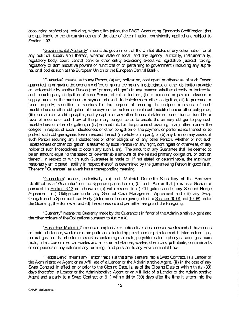 accounting profession) including, without limitation, the FASB Accounting Standards Codification, that are applicable to the circumstances as of the date of determination, consistently applied and subject to Section 1.03. “Governmental Authority” means the government of the United States or any other nation, or of any political subdivision thereof, whether state or local, and any agency, authority, instrumentality, regulatory body, court, central bank or other entity exercising executive, legislative, judicial, taxing, regulatory or administrative powers or functions of or pertaining to government (including any supra- national bodies such as the European Union or the European Central Bank). “Guarantee” means, as to any Person, (a) any obligation, contingent or otherwise, of such Person guaranteeing or having the economic effect of guaranteeing any Indebtedness or other obligation payable or performable by another Person (the “primary obligor”) in any manner, whether directly or indirectly, and including any obligation of such Person, direct or indirect, (i) to purchase or pay (or advance or supply funds for the purchase or payment of) such Indebtedness or other obligation, (ii) to purchase or lease property, securities or services for the purpose of assuring the obligee in respect of such Indebtedness or other obligation of the payment or performance of such Indebtedness or other obligation, (iii) to maintain working capital, equity capital or any other financial statement condition or liquidity or level of income or cash flow of the primary obligor so as to enable the primary obligor to pay such Indebtedness or other obligation, or (iv) entered into for the purpose of assuring in any other manner the obligee in respect of such Indebtedness or other obligation of the payment or performance thereof or to protect such obligee against loss in respect thereof (in whole or in part), or (b) any Lien on any assets of such Person securing any Indebtedness or other obligation of any other Person, whether or not such Indebtedness or other obligation is assumed by such Person (or any right, contingent or otherwise, of any holder of such Indebtedness to obtain any such Lien). The amount of any Guarantee shall be deemed to be an amount equal to the stated or determinable amount of the related primary obligation, or portion thereof, in respect of which such Guarantee is made or, if not stated or determinable, the maximum reasonably anticipated liability in respect thereof as determined by the guaranteeing Person in good faith. The term “Guarantee” as a verb has a corresponding meaning. “Guarantors” means, collectively, (a) each Material Domestic Subsidiary of the Borrower identified as a “Guarantor” on the signature pages hereto, (b) each Person that joins as a Guarantor pursuant to Section 6.13 or otherwise, (c) with respect to (i) Obligations under any Secured Hedge Agreement, (ii) Obligations under any Secured Cash Management Agreement and (iii) any Swap Obligation of a Specified Loan Party (determined before giving effect to Sections 10.01 and 10.08) under the Guaranty, the Borrower, and (d) the successors and permitted assigns of the foregoing. “Guaranty” means the Guaranty made by the Guarantors in favor of the Administrative Agent and the other holders of the Obligations pursuant to Article X. “Hazardous Materials” means all explosive or radioactive substances or wastes and all hazardous or toxic substances, wastes or other pollutants, including petroleum or petroleum distillates, natural gas, natural gas liquids, asbestos or asbestos-containing materials, polychlorinated biphenyls, radon gas, toxic mold, infectious or medical wastes and all other substances, wastes, chemicals, pollutants, contaminants or compounds of any nature in any form regulated pursuant to any Environmental Law. “Hedge Bank” means any Person that (i) at the time it enters into a Swap Contract, is a Lender or the Administrative Agent or an Affiliate of a Lender or the Administrative Agent, (ii) in the case of any Swap Contract in effect on or prior to the Closing Date, is, as of the Closing Date or within thirty (30) days thereafter, a Lender or the Administrative Agent or an Affiliate of a Lender or the Administrative Agent and a party to a Swap Contract or (iii) within thirty (30) days after the time it enters into the 15 CHAR1\1593539v8
