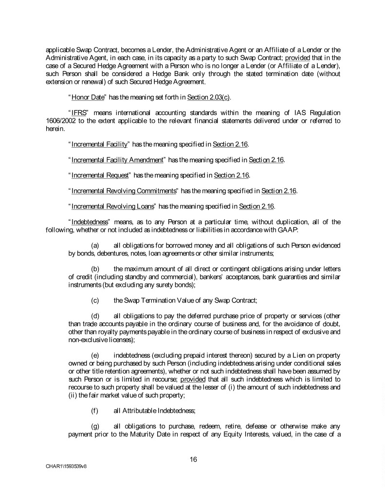 applicable Swap Contract, becomes a Lender, the Administrative Agent or an Affiliate of a Lender or the Administrative Agent, in each case, in its capacity as a party to such Swap Contract; provided that in the case of a Secured Hedge Agreement with a Person who is no longer a Lender (or Affiliate of a Lender), such Person shall be considered a Hedge Bank only through the stated termination date (without extension or renewal) of such Secured Hedge Agreement. “Honor Date” has the meaning set forth in Section 2.03(c). “IFRS” means international accounting standards within the meaning of IAS Regulation 1606/2002 to the extent applicable to the relevant financial statements delivered under or referred to herein. “Incremental Facility” has the meaning specified in Section 2.16. “Incremental Facility Amendment” has the meaning specified in Section 2.16. “Incremental Request” has the meaning specified in Section 2.16. “Incremental Revolving Commitments” has the meaning specified in Section 2.16. “Incremental Revolving Loans” has the meaning specified in Section 2.16. “Indebtedness” means, as to any Person at a particular time, without duplication, all of the following, whether or not included as indebtedness or liabilities in accordance with GAAP: (a) all obligations for borrowed money and all obligations of such Person evidenced by bonds, debentures, notes, loan agreements or other similar instruments; (b) the maximum amount of all direct or contingent obligations arising under letters of credit (including standby and commercial), bankers’ acceptances, bank guaranties and similar instruments (but excluding any surety bonds); (c) the Swap Termination Value of any Swap Contract; (d) all obligations to pay the deferred purchase price of property or services (other than trade accounts payable in the ordinary course of business and, for the avoidance of doubt, other than royalty payments payable in the ordinary course of business in respect of exclusive and non-exclusive licenses); (e) indebtedness (excluding prepaid interest thereon) secured by a Lien on property owned or being purchased by such Person (including indebtedness arising under conditional sales or other title retention agreements), whether or not such indebtedness shall have been assumed by such Person or is limited in recourse; provided that all such indebtedness which is limited to recourse to such property shall be valued at the lesser of (i) the amount of such indebtedness and (ii) the fair market value of such property; (f) all Attributable Indebtedness; (g) all obligations to purchase, redeem, retire, defease or otherwise make any payment prior to the Maturity Date in respect of any Equity Interests, valued, in the case of a 16 CHAR1\1593539v8