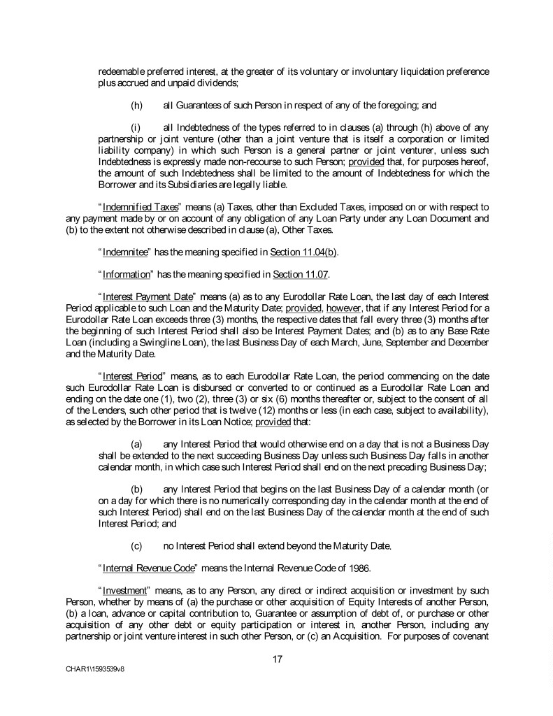 redeemable preferred interest, at the greater of its voluntary or involuntary liquidation preference plus accrued and unpaid dividends; (h) all Guarantees of such Person in respect of any of the foregoing; and (i) all Indebtedness of the types referred to in clauses (a) through (h) above of any partnership or joint venture (other than a joint venture that is itself a corporation or limited liability company) in which such Person is a general partner or joint venturer, unless such Indebtedness is expressly made non-recourse to such Person; provided that, for purposes hereof, the amount of such Indebtedness shall be limited to the amount of Indebtedness for which the Borrower and its Subsidiaries are legally liable. “Indemnified Taxes” means (a) Taxes, other than Excluded Taxes, imposed on or with respect to any payment made by or on account of any obligation of any Loan Party under any Loan Document and (b) to the extent not otherwise described in clause (a), Other Taxes. “Indemnitee” has the meaning specified in Section 11.04(b). “Information” has the meaning specified in Section 11.07. “Interest Payment Date” means (a) as to any Eurodollar Rate Loan, the last day of each Interest Period applicable to such Loan and the Maturity Date; provided, however, that if any Interest Period for a Eurodollar Rate Loan exceeds three (3) months, the respective dates that fall every three (3) months after the beginning of such Interest Period shall also be Interest Payment Dates; and (b) as to any Base Rate Loan (including a Swingline Loan), the last Business Day of each March, June, September and December and the Maturity Date. “Interest Period” means, as to each Eurodollar Rate Loan, the period commencing on the date such Eurodollar Rate Loan is disbursed or converted to or continued as a Eurodollar Rate Loan and ending on the date one (1), two (2), three (3) or six (6) months thereafter or, subject to the consent of all of the Lenders, such other period that is twelve (12) months or less (in each case, subject to availability), as selected by the Borrower in its Loan Notice; provided that: (a) any Interest Period that would otherwise end on a day that is not a Business Day shall be extended to the next succeeding Business Day unless such Business Day falls in another calendar month, in which case such Interest Period shall end on the next preceding Business Day; (b) any Interest Period that begins on the last Business Day of a calendar month (or on a day for which there is no numerically corresponding day in the calendar month at the end of such Interest Period) shall end on the last Business Day of the calendar month at the end of such Interest Period; and (c) no Interest Period shall extend beyond the Maturity Date. “Internal Revenue Code” means the Internal Revenue Code of 1986. “Investment” means, as to any Person, any direct or indirect acquisition or investment by such Person, whether by means of (a) the purchase or other acquisition of Equity Interests of another Person, (b) a loan, advance or capital contribution to, Guarantee or assumption of debt of, or purchase or other acquisition of any other debt or equity participation or interest in, another Person, including any partnership or joint venture interest in such other Person, or (c) an Acquisition. For purposes of covenant 17 CHAR1\1593539v8