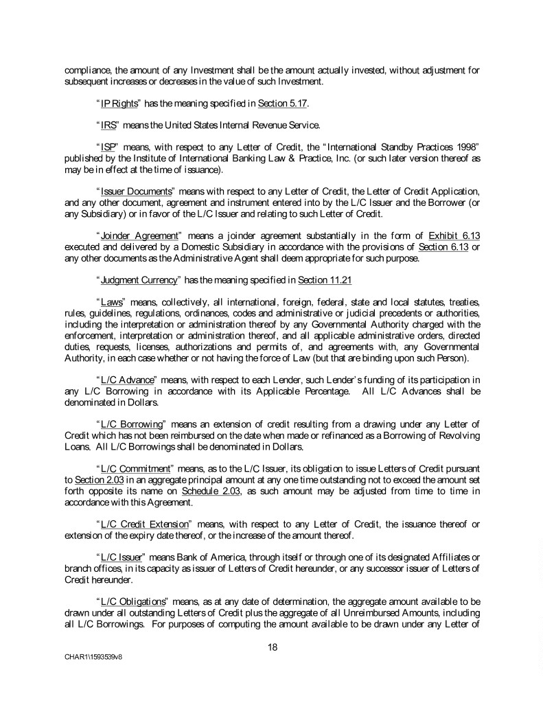 compliance, the amount of any Investment shall be the amount actually invested, without adjustment for subsequent increases or decreases in the value of such Investment. “IP Rights” has the meaning specified in Section 5.17. “IRS” means the United States Internal Revenue Service. “ISP” means, with respect to any Letter of Credit, the “International Standby Practices 1998” published by the Institute of International Banking Law & Practice, Inc. (or such later version thereof as may be in effect at the time of issuance). “Issuer Documents” means with respect to any Letter of Credit, the Letter of Credit Application, and any other document, agreement and instrument entered into by the L/C Issuer and the Borrower (or any Subsidiary) or in favor of the L/C Issuer and relating to such Letter of Credit. “Joinder Agreement” means a joinder agreement substantially in the form of Exhibit 6.13 executed and delivered by a Domestic Subsidiary in accordance with the provisions of Section 6.13 or any other documents as the Administrative Agent shall deem appropriate for such purpose. “Judgment Currency” has the meaning specified in Section 11.21 “Laws” means, collectively, all international, foreign, federal, state and local statutes, treaties, rules, guidelines, regulations, ordinances, codes and administrative or judicial precedents or authorities, including the interpretation or administration thereof by any Governmental Authority charged with the enforcement, interpretation or administration thereof, and all applicable administrative orders, directed duties, requests, licenses, authorizations and permits of, and agreements with, any Governmental Authority, in each case whether or not having the force of Law (but that are binding upon such Person). “L/C Advance” means, with respect to each Lender, such Lender’s funding of its participation in any L/C Borrowing in accordance with its Applicable Percentage. All L/C Advances shall be denominated in Dollars. “L/C Borrowing” means an extension of credit resulting from a drawing under any Letter of Credit which has not been reimbursed on the date when made or refinanced as a Borrowing of Revolving Loans. All L/C Borrowings shall be denominated in Dollars. “L/C Commitment” means, as to the L/C Issuer, its obligation to issue Letters of Credit pursuant to Section 2.03 in an aggregate principal amount at any one time outstanding not to exceed the amount set forth opposite its name on Schedule 2.03, as such amount may be adjusted from time to time in accordance with this Agreement. “L/C Credit Extension” means, with respect to any Letter of Credit, the issuance thereof or extension of the expiry date thereof, or the increase of the amount thereof. “L/C Issuer” means Bank of America, through itself or through one of its designated Affiliates or branch offices, in its capacity as issuer of Letters of Credit hereunder, or any successor issuer of Letters of Credit hereunder. “L/C Obligations” means, as at any date of determination, the aggregate amount available to be drawn under all outstanding Letters of Credit plus the aggregate of all Unreimbursed Amounts, including all L/C Borrowings. For purposes of computing the amount available to be drawn under any Letter of 18 CHAR1\1593539v8