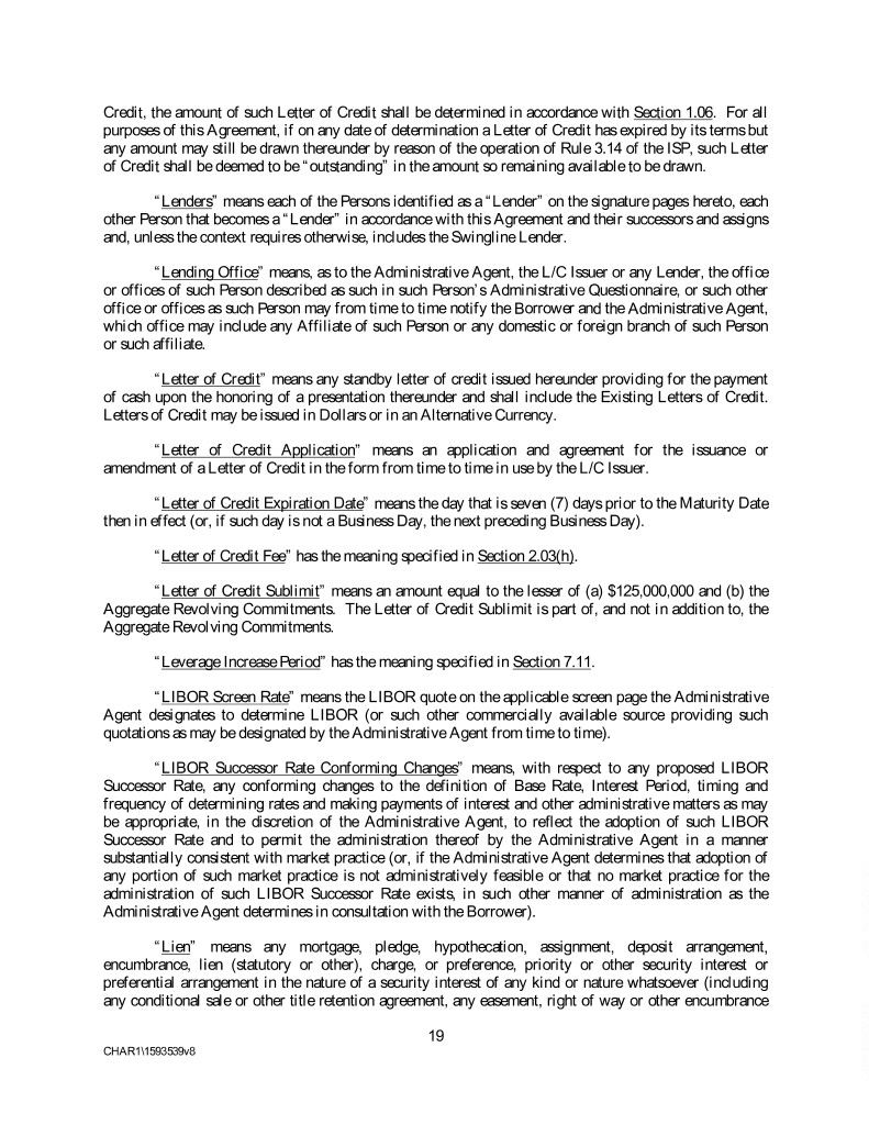 Credit, the amount of such Letter of Credit shall be determined in accordance with Section 1.06. For all purposes of this Agreement, if on any date of determination a Letter of Credit has expired by its terms but any amount may still be drawn thereunder by reason of the operation of Rule 3.14 of the ISP, such Letter of Credit shall be deemed to be “outstanding” in the amount so remaining available to be drawn. “Lenders” means each of the Persons identified as a “Lender” on the signature pages hereto, each other Person that becomes a “Lender” in accordance with this Agreement and their successors and assigns and, unless the context requires otherwise, includes the Swingline Lender. “Lending Office” means, as to the Administrative Agent, the L/C Issuer or any Lender, the office or offices of such Person described as such in such Person’s Administrative Questionnaire, or such other office or offices as such Person may from time to time notify the Borrower and the Administrative Agent, which office may include any Affiliate of such Person or any domestic or foreign branch of such Person or such affiliate. “Letter of Credit” means any standby letter of credit issued hereunder providing for the payment of cash upon the honoring of a presentation thereunder and shall include the Existing Letters of Credit. Letters of Credit may be issued in Dollars or in an Alternative Currency. “Letter of Credit Application” means an application and agreement for the issuance or amendment of a Letter of Credit in the form from time to time in use by the L/C Issuer. “Letter of Credit Expiration Date” means the day that is seven (7) days prior to the Maturity Date then in effect (or, if such day is not a Business Day, the next preceding Business Day). “Letter of Credit Fee” has the meaning specified in Section 2.03(h). “Letter of Credit Sublimit” means an amount equal to the lesser of (a) $125,000,000 and (b) the Aggregate Revolving Commitments. The Letter of Credit Sublimit is part of, and not in addition to, the Aggregate Revolving Commitments. “Leverage Increase Period” has the meaning specified in Section 7.11. “LIBOR Screen Rate” means the LIBOR quote on the applicable screen page the Administrative Agent designates to determine LIBOR (or such other commercially available source providing such quotations as may be designated by the Administrative Agent from time to time). “LIBOR Successor Rate Conforming Changes” means, with respect to any proposed LIBOR Successor Rate, any conforming changes to the definition of Base Rate, Interest Period, timing and frequency of determining rates and making payments of interest and other administrative matters as may be appropriate, in the discretion of the Administrative Agent, to reflect the adoption of such LIBOR Successor Rate and to permit the administration thereof by the Administrative Agent in a manner substantially consistent with market practice (or, if the Administrative Agent determines that adoption of any portion of such market practice is not administratively feasible or that no market practice for the administration of such LIBOR Successor Rate exists, in such other manner of administration as the Administrative Agent determines in consultation with the Borrower). “Lien” means any mortgage, pledge, hypothecation, assignment, deposit arrangement, encumbrance, lien (statutory or other), charge, or preference, priority or other security interest or preferential arrangement in the nature of a security interest of any kind or nature whatsoever (including any conditional sale or other title retention agreement, any easement, right of way or other encumbrance 19 CHAR1\1593539v8