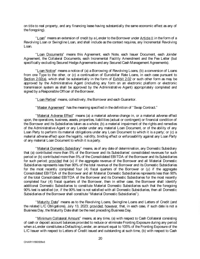 on title to real property, and any financing lease having substantially the same economic effect as any of the foregoing). “Loan” means an extension of credit by a Lender to the Borrower under Article II in the form of a Revolving Loan or Swingline Loan, and shall include as the context requires, any Incremental Revolving Loan. “Loan Documents” means this Agreement, each Note, each Issuer Document, each Joinder Agreement, the Collateral Documents, each Incremental Facility Amendment and the Fee Letter (but specifically excluding Secured Hedge Agreements and any Secured Cash Management Agreements). “Loan Notice” means a notice of (a) a Borrowing of Revolving Loans, (b) a conversion of Loans from one Type to the other, or (c) a continuation of Eurodollar Rate Loans, in each case pursuant to Section 2.02(a), which shall be substantially in the form of Exhibit 2.02 or such other form as may be approved by the Administrative Agent (including any form on an electronic platform or electronic transmission system as shall be approved by the Administrative Agent) appropriately completed and signed by a Responsible Officer of the Borrower. “Loan Parties” means, collectively, the Borrower and each Guarantor. “Master Agreement” has the meaning specified in the definition of “Swap Contract.” “Material Adverse Effect” means (a) a material adverse change in, or a material adverse effect upon, the operations, business, assets, properties, liabilities (actual or contingent) or financial condition of the Borrower and its Subsidiaries taken as a whole; (b) a material impairment of the rights and remedies of the Administrative Agent or any Lender under any material Loan Document, or of the ability of any Loan Party to perform its material obligations under any Loan Document to which it is a party; or (c) a material adverse effect upon the legality, validity, binding effect or enforceability against any Loan Party of any material Loan Document to which it is a party. “Material Domestic Subsidiary” means, as of any date of determination, any Domestic Subsidiary that (a) contributed more than 5% of the Borrower and its Subsidiaries’ consolidated revenues for such period or (b) contributed more than 5% of the Consolidated EBITDA of the Borrower and its Subsidiaries for such period; provided that (x) if the aggregate revenue of the Borrower and all Material Domestic Subsidiaries represents less than 90% of the total revenue of the Borrower and its Domestic Subsidiaries for the most recently completed four (4) fiscal quarters of the Borrower or (y) if the aggregate Consolidated EBITDA of the Borrower and all Material Domestic Subsidiaries represents less than 90% of the total Consolidated EBITDA of the Borrower and its Domestic Subsidiaries for the most recently completed four (4) fiscal quarters of the Borrower, then in either case, the Borrower shall identify additional Domestic Subsidiaries to constitute Material Domestic Subsidiaries such that the foregoing 90% test is satisfied (or, if the 90% test is not satisfied with all Domestic Subsidiaries, then all Domestic Subsidiaries of the Borrower shall constitute “Material Domestic Subsidiaries”). “Maturity Date” means as to the Revolving Loans, Swingline Loans and Letters of Credit (and the related L/C Obligations), July 13, 2023; provided, however, that, in each case, if such date is not a Business Day, the Maturity Date shall be the next preceding Business Day. “Minimum Collateral Amount” means, at any time, (a) with respect to Cash Collateral consisting of cash or deposit account balances provided to reduce or eliminate Fronting Exposure during any period when a Lender constitutes a Defaulting Lender, an amount equal to 105% of the Fronting Exposure of the L/C Issuer with respect to Letters of Credit issued and outstanding at such time, (b) with respect to Cash 20 CHAR1\1593539v8
