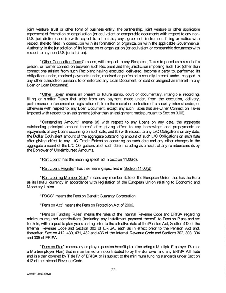 joint venture, trust or other form of business entity, the partnership, joint venture or other applicable agreement of formation or organization (or equivalent or comparable documents with respect to any non- U.S. jurisdiction) and (d) with respect to all entities, any agreement, instrument, filing or notice with respect thereto filed in connection with its formation or organization with the applicable Governmental Authority in the jurisdiction of its formation or organization (or equivalent or comparable documents with respect to any non-U.S. jurisdiction). “Other Connection Taxes” means, with respect to any Recipient, Taxes imposed as a result of a present or former connection between such Recipient and the jurisdiction imposing such Tax (other than connections arising from such Recipient having executed, delivered, become a party to, performed its obligations under, received payments under, received or perfected a security interest under, engaged in any other transaction pursuant to or enforced any Loan Document, or sold or assigned an interest in any Loan or Loan Document). “Other Taxes” means all present or future stamp, court or documentary, intangible, recording, filing or similar Taxes that arise from any payment made under, from the execution, delivery, performance, enforcement or registration of, from the receipt or perfection of a security interest under, or otherwise with respect to, any Loan Document, except any such Taxes that are Other Connection Taxes imposed with respect to an assignment (other than an assignment made pursuant to Section 3.06). “Outstanding Amount” means (a) with respect to any Loans on any date, the aggregate outstanding principal amount thereof after giving effect to any borrowings and prepayments or repayments of any Loans occurring on such date; and (b) with respect to any L/C Obligations on any date, the Dollar Equivalent amount of the aggregate outstanding amount of such L/C Obligations on such date after giving effect to any L/C Credit Extension occurring on such date and any other changes in the aggregate amount of the L/C Obligations as of such date, including as a result of any reimbursements by the Borrower of Unreimbursed Amounts. “Participant” has the meaning specified in Section 11.06(d). “Participant Register” has the meaning specified in Section 11.06(d). “Participating Member State” means any member state of the European Union that has the Euro as its lawful currency in accordance with legislation of the European Union relating to Economic and Monetary Union. “PBGC” means the Pension Benefit Guaranty Corporation. “Pension Act” means the Pension Protection Act of 2006. “Pension Funding Rules” means the rules of the Internal Revenue Code and ERISA regarding minimum required contributions (including any installment payment thereof) to Pension Plans and set forth in, with respect to plan years ending prior to the effective date of the Pension Act, Section 412 of the Internal Revenue Code and Section 302 of ERISA, each as in effect prior to the Pension Act and, thereafter, Section 412, 430, 431, 432 and 436 of the Internal Revenue Code and Sections 302, 303, 304 and 305 of ERISA. “Pension Plan” means any employee pension benefit plan (including a Multiple Employer Plan or a Multiemployer Plan) that is maintained or is contributed to by the Borrower and any ERISA Affiliate and is either covered by Title IV of ERISA or is subject to the minimum funding standards under Section 412 of the Internal Revenue Code. 22 CHAR1\1593539v8