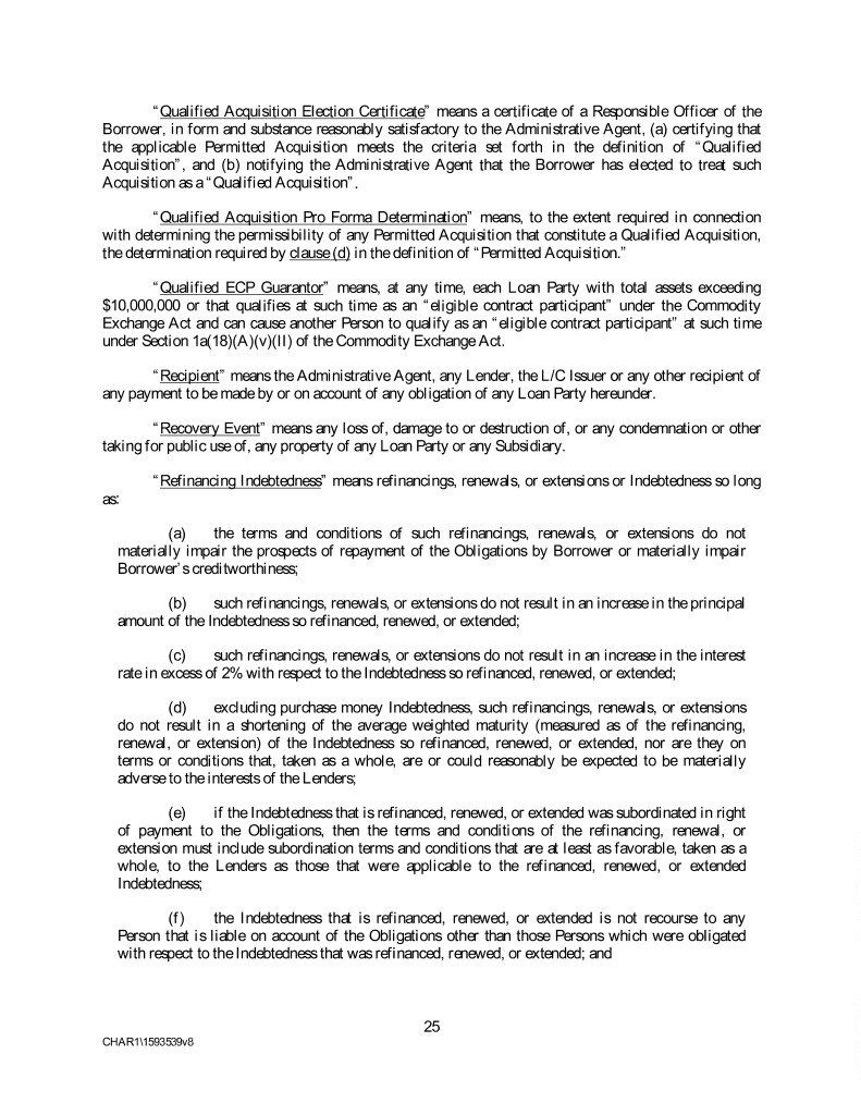 “Qualified Acquisition Election Certificate” means a certificate of a Responsible Officer of the Borrower, in form and substance reasonably satisfactory to the Administrative Agent, (a) certifying that the applicable Permitted Acquisition meets the criteria set forth in the definition of “Qualified Acquisition”, and (b) notifying the Administrative Agent that the Borrower has elected to treat such Acquisition as a “Qualified Acquisition”. “Qualified Acquisition Pro Forma Determination” means, to the extent required in connection with determining the permissibility of any Permitted Acquisition that constitute a Qualified Acquisition, the determination required by clause (d) in the definition of “Permitted Acquisition.” “Qualified ECP Guarantor” means, at any time, each Loan Party with total assets exceeding $10,000,000 or that qualifies at such time as an “eligible contract participant” under the Commodity Exchange Act and can cause another Person to qualify as an “eligible contract participant” at such time under Section 1a(18)(A)(v)(II) of the Commodity Exchange Act. “Recipient” means the Administrative Agent, any Lender, the L/C Issuer or any other recipient of any payment to be made by or on account of any obligation of any Loan Party hereunder. “Recovery Event” means any loss of, damage to or destruction of, or any condemnation or other taking for public use of, any property of any Loan Party or any Subsidiary. “Refinancing Indebtedness” means refinancings, renewals, or extensions or Indebtedness so long as: (a) the terms and conditions of such refinancings, renewals, or extensions do not materially impair the prospects of repayment of the Obligations by Borrower or materially impair Borrower’s creditworthiness; (b) such refinancings, renewals, or extensions do not result in an increase in the principal amount of the Indebtedness so refinanced, renewed, or extended; (c) such refinancings, renewals, or extensions do not result in an increase in the interest rate in excess of 2% with respect to the Indebtedness so refinanced, renewed, or extended; (d) excluding purchase money Indebtedness, such refinancings, renewals, or extensions do not result in a shortening of the average weighted maturity (measured as of the refinancing, renewal, or extension) of the Indebtedness so refinanced, renewed, or extended, nor are they on terms or conditions that, taken as a whole, are or could reasonably be expected to be materially adverse to the interests of the Lenders; (e) if the Indebtedness that is refinanced, renewed, or extended was subordinated in right of payment to the Obligations, then the terms and conditions of the refinancing, renewal, or extension must include subordination terms and conditions that are at least as favorable, taken as a whole, to the Lenders as those that were applicable to the refinanced, renewed, or extended Indebtedness; (f) the Indebtedness that is refinanced, renewed, or extended is not recourse to any Person that is liable on account of the Obligations other than those Persons which were obligated with respect to the Indebtedness that was refinanced, renewed, or extended; and 25 CHAR1\1593539v8