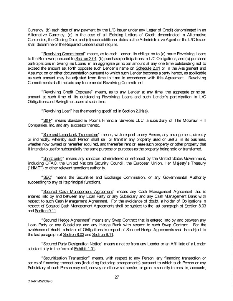 Currency, (b) each date of any payment by the L/C Issuer under any Letter of Credit denominated in an Alternative Currency, (c) in the case of all Existing Letters of Credit denominated in Alternative Currencies, the Closing Date, and (d) such additional dates as the Administrative Agent or the L/C Issuer shall determine or the Required Lenders shall require. “Revolving Commitment” means, as to each Lender, its obligation to (a) make Revolving Loans to the Borrower pursuant to Section 2.01, (b) purchase participations in L/C Obligations, and (c) purchase participations in Swingline Loans, in an aggregate principal amount at any one time outstanding not to exceed the amount set forth opposite such Lender’s name on Schedule 2.01 or in the Assignment and Assumption or other documentation pursuant to which such Lender becomes a party hereto, as applicable as such amount may be adjusted from time to time in accordance with this Agreement. Revolving Commitments shall include any Incremental Revolving Commitment. “Revolving Credit Exposure” means, as to any Lender at any time, the aggregate principal amount at such time of its outstanding Revolving Loans and such Lender’s participation in L/C Obligations and Swingline Loans at such time. “Revolving Loan” has the meaning specified in Section 2.01(a). “S&P” means Standard & Poor’s Financial Services LLC, a subsidiary of The McGraw Hill Companies, Inc. and any successor thereto. “Sale and Leaseback Transaction” means, with respect to any Person, any arrangement, directly or indirectly, whereby such Person shall sell or transfer any property used or useful in its business, whether now owned or hereafter acquired, and thereafter rent or lease such property or other property that it intends to use for substantially the same purpose or purposes as the property being sold or transferred. “Sanction(s)” means any sanction administered or enforced by the United States Government, including OFAC, the United Nations Security Council, the European Union, Her Majesty’s Treasury (“HMT”) or other relevant sanctions authority. “SEC” means the Securities and Exchange Commission, or any Governmental Authority succeeding to any of its principal functions. “Secured Cash Management Agreement” means any Cash Management Agreement that is entered into by and between any Loan Party or any Subsidiary and any Cash Management Bank with respect to such Cash Management Agreement. For the avoidance of doubt, a holder of Obligations in respect of Secured Cash Management Agreements shall be subject to the last paragraph of Section 8.03 and Section 9.11. “Secured Hedge Agreement” means any Swap Contract that is entered into by and between any Loan Party or any Subsidiary and any Hedge Bank with respect to such Swap Contract. For the avoidance of doubt, a holder of Obligations in respect of Secured Hedge Agreements shall be subject to the last paragraph of Section 8.03 and Section 9.11. “Secured Party Designation Notice” means a notice from any Lender or an Affiliate of a Lender substantially in the form of Exhibit 1.01. “Securitization Transaction” means, with respect to any Person, any financing transaction or series of financing transactions (including factoring arrangements) pursuant to which such Person or any Subsidiary of such Person may sell, convey or otherwise transfer, or grant a security interest in, accounts, 27 CHAR1\1593539v8