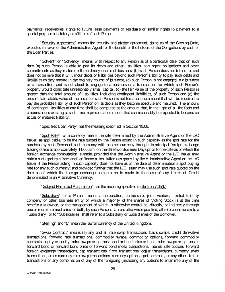 payments, receivables, rights to future lease payments or residuals or similar rights to payment to a special purpose subsidiary or affiliate of such Person. “Security Agreement” means the security and pledge agreement, dated as of the Closing Date, executed in favor of the Administrative Agent for the benefit of the holders of the Obligations by each of the Loan Parties. “Solvent” or “Solvency” means, with respect to any Person as of a particular date, that on such date (a) such Person is able to pay its debts and other liabilities, contingent obligations and other commitments as they mature in the ordinary course of business, (b) such Person does not intend to, and does not believe that it will, incur debts or liabilities beyond such Person’s ability to pay such debts and liabilities as they mature in the ordinary course of business, (c) such Person is not engaged in a business or a transaction, and is not about to engage in a business or a transaction, for which such Person’s property would constitute unreasonably small capital, (d) the fair value of the property of such Person is greater than the total amount of liabilities, including contingent liabilities, of such Person and (e) the present fair salable value of the assets of such Person is not less than the amount that will be required to pay the probable liability of such Person on its debts as they become absolute and matured. The amount of contingent liabilities at any time shall be computed as the amount that, in the light of all the facts and circumstances existing at such time, represents the amount that can reasonably be expected to become an actual or matured liability. “Specified Loan Party” has the meaning specified in Section 10.08. “Spot Rate” for a currency means the rate determined by the Administrative Agent or the L/C Issuer, as applicable, to be the rate quoted by the Person acting in such capacity as the spot rate for the purchase by such Person of such currency with another currency through its principal foreign exchange trading office at approximately 11:00 a.m. on the date two Business Days prior to the date as of which the foreign exchange computation is made; provided that the Administrative Agent or the L/C Issuer may obtain such spot rate from another financial institution designated by the Administrative Agent or the L/C Issuer if the Person acting in such capacity does not have as of the date of determination a spot buying rate for any such currency; and provided further that the L/C Issuer may use such spot rate quoted on the date as of which the foreign exchange computation is made in the case of any Letter of Credit denominated in an Alternative Currency. “Subject Permitted Acquisition” has the meaning specified in Section 7.05(b). “Subsidiary” of a Person means a corporation, partnership, joint venture, limited liability company or other business entity of which a majority of the shares of Voting Stock is at the time beneficially owned, or the management of which is otherwise controlled, directly, or indirectly through one or more intermediaries, or both, by such Person. Unless otherwise specified, all references herein to a “Subsidiary” or to “Subsidiaries” shall refer to a Subsidiary or Subsidiaries of the Borrower. “Sterling” and “£” mean the lawful currency of the United Kingdom. “Swap Contract” means (a) any and all rate swap transactions, basis swaps, credit derivative transactions, forward rate transactions, commodity swaps, commodity options, forward commodity contracts, equity or equity index swaps or options, bond or bond price or bond index swaps or options or forward bond or forward bond price or forward bond index transactions, interest rate options, forward foreign exchange transactions, cap transactions, floor transactions, collar transactions, currency swap transactions, cross-currency rate swap transactions, currency options, spot contracts, or any other similar transactions or any combination of any of the foregoing (including any options to enter into any of the 28 CHAR1\1593539v8