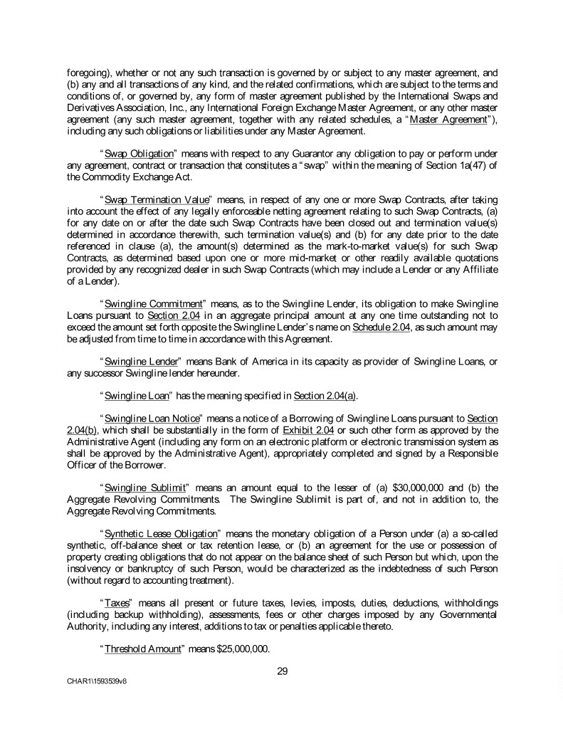 foregoing), whether or not any such transaction is governed by or subject to any master agreement, and (b) any and all transactions of any kind, and the related confirmations, which are subject to the terms and conditions of, or governed by, any form of master agreement published by the International Swaps and Derivatives Association, Inc., any International Foreign Exchange Master Agreement, or any other master agreement (any such master agreement, together with any related schedules, a “Master Agreement”), including any such obligations or liabilities under any Master Agreement. “Swap Obligation” means with respect to any Guarantor any obligation to pay or perform under any agreement, contract or transaction that constitutes a “swap” within the meaning of Section 1a(47) of the Commodity Exchange Act. “Swap Termination Value” means, in respect of any one or more Swap Contracts, after taking into account the effect of any legally enforceable netting agreement relating to such Swap Contracts, (a) for any date on or after the date such Swap Contracts have been closed out and termination value(s) determined in accordance therewith, such termination value(s) and (b) for any date prior to the date referenced in clause (a), the amount(s) determined as the mark-to-market value(s) for such Swap Contracts, as determined based upon one or more mid-market or other readily available quotations provided by any recognized dealer in such Swap Contracts (which may include a Lender or any Affiliate of a Lender). “Swingline Commitment” means, as to the Swingline Lender, its obligation to make Swingline Loans pursuant to Section 2.04 in an aggregate principal amount at any one time outstanding not to exceed the amount set forth opposite the Swingline Lender’s name on Schedule 2.04, as such amount may be adjusted from time to time in accordance with this Agreement. “Swingline Lender” means Bank of America in its capacity as provider of Swingline Loans, or any successor Swingline lender hereunder. “Swingline Loan” has the meaning specified in Section 2.04(a). “Swingline Loan Notice” means a notice of a Borrowing of Swingline Loans pursuant to Section 2.04(b), which shall be substantially in the form of Exhibit 2.04 or such other form as approved by the Administrative Agent (including any form on an electronic platform or electronic transmission system as shall be approved by the Administrative Agent), appropriately completed and signed by a Responsible Officer of the Borrower. “Swingline Sublimit” means an amount equal to the lesser of (a) $30,000,000 and (b) the Aggregate Revolving Commitments. The Swingline Sublimit is part of, and not in addition to, the Aggregate Revolving Commitments. “Synthetic Lease Obligation” means the monetary obligation of a Person under (a) a so-called synthetic, off-balance sheet or tax retention lease, or (b) an agreement for the use or possession of property creating obligations that do not appear on the balance sheet of such Person but which, upon the insolvency or bankruptcy of such Person, would be characterized as the indebtedness of such Person (without regard to accounting treatment). “Taxes” means all present or future taxes, levies, imposts, duties, deductions, withholdings (including backup withholding), assessments, fees or other charges imposed by any Governmental Authority, including any interest, additions to tax or penalties applicable thereto. “Threshold Amount” means $25,000,000. 29 CHAR1\1593539v8