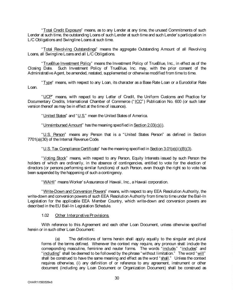 “Total Credit Exposure” means, as to any Lender at any time, the unused Commitments of such Lender at such time, the outstanding Loans of such Lender at such time and such Lender’s participation in L/C Obligations and Swingline Loans at such time. “Total Revolving Outstandings” means the aggregate Outstanding Amount of all Revolving Loans, all Swingline Loans and all L/C Obligations. “TrueBlue Investment Policy” means the Investment Policy of TrueBlue, Inc., in effect as of the Closing Date. Such Investment Policy of TrueBlue, Inc. may, with the prior consent of the Administrative Agent, be amended, restated, supplemented or otherwise modified from time to time. “Type” means, with respect to any Loan, its character as a Base Rate Loan or a Eurodollar Rate Loan. “UCP” means, with respect to any Letter of Credit, the Uniform Customs and Practice for Documentary Credits, International Chamber of Commerce (“ICC”) Publication No. 600 (or such later version thereof as may be in effect at the time of issuance). “United States” and “U.S.” mean the United States of America. “Unreimbursed Amount” has the meaning specified in Section 2.03(c)(i). “U.S. Person” means any Person that is a “United States Person” as defined in Section 7701(a)(30) of the Internal Revenue Code. “U.S. Tax Compliance Certificate” has the meaning specified in Section 3.01(e)(ii)(B)(3). “Voting Stock” means, with respect to any Person, Equity Interests issued by such Person the holders of which are ordinarily, in the absence of contingencies, entitled to vote for the election of directors (or persons performing similar functions) of such Person, even though the right so to vote has been suspended by the happening of such a contingency. “WAHI” means Worker’s Assurance of Hawaii, Inc., a Hawaii corporation. “Write-Down and Conversion Powers” means, with respect to any EEA Resolution Authority, the write-down and conversion powers of such EEA Resolution Authority from time to time under the Bail-In Legislation for the applicable EEA Member Country, which write-down and conversion powers are described in the EU Bail-In Legislation Schedule. 1.02 Other Interpretive Provisions. With reference to this Agreement and each other Loan Document, unless otherwise specified herein or in such other Loan Document: (a) The definitions of terms herein shall apply equally to the singular and plural forms of the terms defined. Whenever the context may require, any pronoun shall include the corresponding masculine, feminine and neuter forms. The words “include,” “includes” and “including” shall be deemed to be followed by the phrase “without limitation.” The word “will” shall be construed to have the same meaning and effect as the word “shall.” Unless the context requires otherwise, (i) any definition of or reference to any agreement, instrument or other document (including any Loan Document or Organization Document) shall be construed as 30 CHAR1\1593539v8