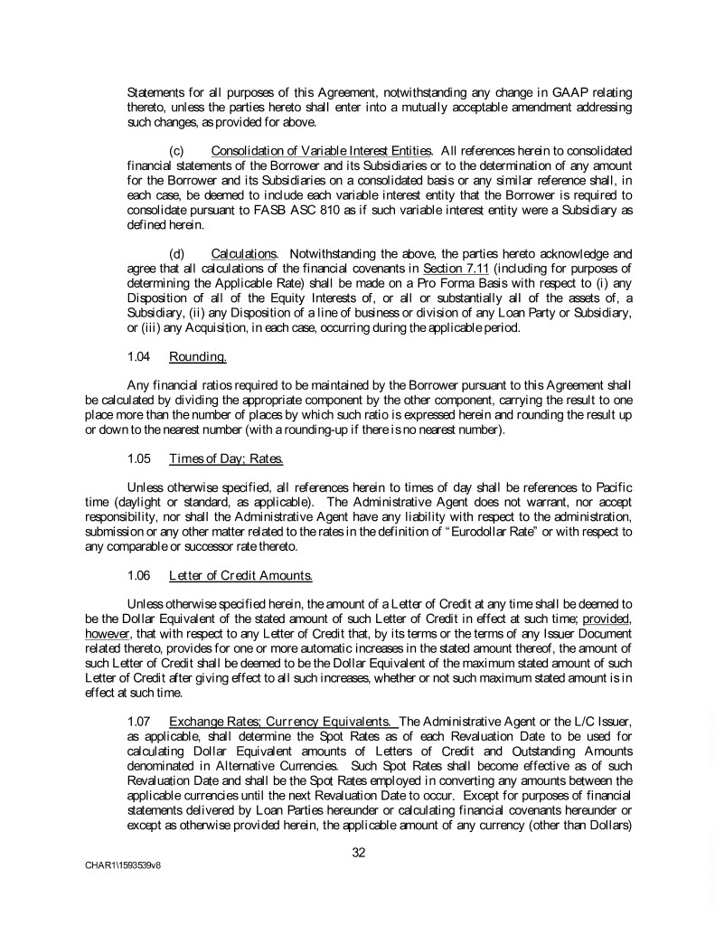 Statements for all purposes of this Agreement, notwithstanding any change in GAAP relating thereto, unless the parties hereto shall enter into a mutually acceptable amendment addressing such changes, as provided for above. (c) Consolidation of Variable Interest Entities. All references herein to consolidated financial statements of the Borrower and its Subsidiaries or to the determination of any amount for the Borrower and its Subsidiaries on a consolidated basis or any similar reference shall, in each case, be deemed to include each variable interest entity that the Borrower is required to consolidate pursuant to FASB ASC 810 as if such variable interest entity were a Subsidiary as defined herein. (d) Calculations. Notwithstanding the above, the parties hereto acknowledge and agree that all calculations of the financial covenants in Section 7.11 (including for purposes of determining the Applicable Rate) shall be made on a Pro Forma Basis with respect to (i) any Disposition of all of the Equity Interests of, or all or substantially all of the assets of, a Subsidiary, (ii) any Disposition of a line of business or division of any Loan Party or Subsidiary, or (iii) any Acquisition, in each case, occurring during the applicable period. 1.04 Rounding. Any financial ratios required to be maintained by the Borrower pursuant to this Agreement shall be calculated by dividing the appropriate component by the other component, carrying the result to one place more than the number of places by which such ratio is expressed herein and rounding the result up or down to the nearest number (with a rounding-up if there is no nearest number). 1.05 Times of Day; Rates. Unless otherwise specified, all references herein to times of day shall be references to Pacific time (daylight or standard, as applicable). The Administrative Agent does not warrant, nor accept responsibility, nor shall the Administrative Agent have any liability with respect to the administration, submission or any other matter related to the rates in the definition of “Eurodollar Rate” or with respect to any comparable or successor rate thereto. 1.06 Letter of Credit Amounts. Unless otherwise specified herein, the amount of a Letter of Credit at any time shall be deemed to be the Dollar Equivalent of the stated amount of such Letter of Credit in effect at such time; provided, however, that with respect to any Letter of Credit that, by its terms or the terms of any Issuer Document related thereto, provides for one or more automatic increases in the stated amount thereof, the amount of such Letter of Credit shall be deemed to be the Dollar Equivalent of the maximum stated amount of such Letter of Credit after giving effect to all such increases, whether or not such maximum stated amount is in effect at such time. 1.07 Exchange Rates; Currency Equivalents. The Administrative Agent or the L/C Issuer, as applicable, shall determine the Spot Rates as of each Revaluation Date to be used for calculating Dollar Equivalent amounts of Letters of Credit and Outstanding Amounts denominated in Alternative Currencies. Such Spot Rates shall become effective as of such Revaluation Date and shall be the Spot Rates employed in converting any amounts between the applicable currencies until the next Revaluation Date to occur. Except for purposes of financial statements delivered by Loan Parties hereunder or calculating financial covenants hereunder or except as otherwise provided herein, the applicable amount of any currency (other than Dollars) 32 CHAR1\1593539v8