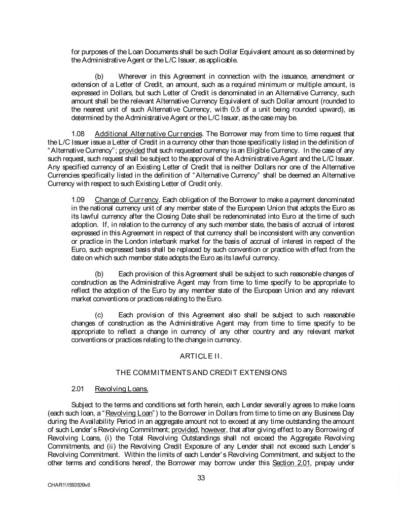 for purposes of the Loan Documents shall be such Dollar Equivalent amount as so determined by the Administrative Agent or the L/C Issuer, as applicable. (b) Wherever in this Agreement in connection with the issuance, amendment or extension of a Letter of Credit, an amount, such as a required minimum or multiple amount, is expressed in Dollars, but such Letter of Credit is denominated in an Alternative Currency, such amount shall be the relevant Alternative Currency Equivalent of such Dollar amount (rounded to the nearest unit of such Alternative Currency, with 0.5 of a unit being rounded upward), as determined by the Administrative Agent or the L/C Issuer, as the case may be. 1.08 Additional Alternative Currencies. The Borrower may from time to time request that the L/C Issuer issue a Letter of Credit in a currency other than those specifically listed in the definition of “Alternative Currency”; provided that such requested currency is an Eligible Currency. In the case of any such request, such request shall be subject to the approval of the Administrative Agent and the L/C Issuer. Any specified currency of an Existing Letter of Credit that is neither Dollars nor one of the Alternative Currencies specifically listed in the definition of “Alternative Currency” shall be deemed an Alternative Currency with respect to such Existing Letter of Credit only. 1.09 Change of Currency. Each obligation of the Borrower to make a payment denominated in the national currency unit of any member state of the European Union that adopts the Euro as its lawful currency after the Closing Date shall be redenominated into Euro at the time of such adoption. If, in relation to the currency of any such member state, the basis of accrual of interest expressed in this Agreement in respect of that currency shall be inconsistent with any convention or practice in the London interbank market for the basis of accrual of interest in respect of the Euro, such expressed basis shall be replaced by such convention or practice with effect from the date on which such member state adopts the Euro as its lawful currency. (b) Each provision of this Agreement shall be subject to such reasonable changes of construction as the Administrative Agent may from time to time specify to be appropriate to reflect the adoption of the Euro by any member state of the European Union and any relevant market conventions or practices relating to the Euro. (c) Each provision of this Agreement also shall be subject to such reasonable changes of construction as the Administrative Agent may from time to time specify to be appropriate to reflect a change in currency of any other country and any relevant market conventions or practices relating to the change in currency. ARTICLE II. THE COMMITMENTS AND CREDIT EXTENSIONS 2.01 Revolving Loans. Subject to the terms and conditions set forth herein, each Lender severally agrees to make loans (each such loan, a “Revolving Loan”) to the Borrower in Dollars from time to time on any Business Day during the Availability Period in an aggregate amount not to exceed at any time outstanding the amount of such Lender’s Revolving Commitment; provided, however, that after giving effect to any Borrowing of Revolving Loans, (i) the Total Revolving Outstandings shall not exceed the Aggregate Revolving Commitments, and (ii) the Revolving Credit Exposure of any Lender shall not exceed such Lender’s Revolving Commitment. Within the limits of each Lender’s Revolving Commitment, and subject to the other terms and conditions hereof, the Borrower may borrow under this Section 2.01, prepay under 33 CHAR1\1593539v8