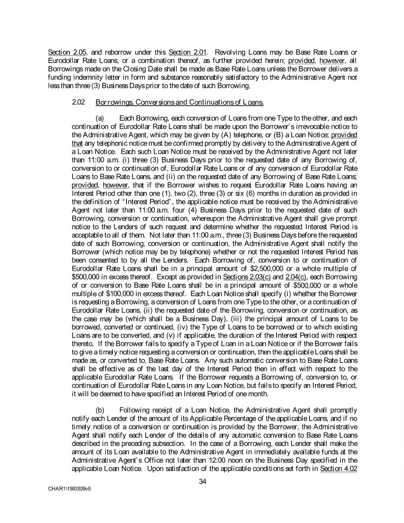 Section 2.05, and reborrow under this Section 2.01. Revolving Loans may be Base Rate Loans or Eurodollar Rate Loans, or a combination thereof, as further provided herein; provided, however, all Borrowings made on the Closing Date shall be made as Base Rate Loans unless the Borrower delivers a funding indemnity letter in form and substance reasonably satisfactory to the Administrative Agent not less than three (3) Business Days prior to the date of such Borrowing. 2.02 Borrowings, Conversions and Continuations of Loans. (a) Each Borrowing, each conversion of Loans from one Type to the other, and each continuation of Eurodollar Rate Loans shall be made upon the Borrower’s irrevocable notice to the Administrative Agent, which may be given by (A) telephone, or (B) a Loan Notice; provided that any telephonic notice must be confirmed promptly by delivery to the Administrative Agent of a Loan Notice. Each such Loan Notice must be received by the Administrative Agent not later than 11:00 a.m. (i) three (3) Business Days prior to the requested date of any Borrowing of, conversion to or continuation of, Eurodollar Rate Loans or of any conversion of Eurodollar Rate Loans to Base Rate Loans, and (ii) on the requested date of any Borrowing of Base Rate Loans; provided, however, that if the Borrower wishes to request Eurodollar Rate Loans having an Interest Period other than one (1), two (2), three (3) or six (6) months in duration as provided in the definition of “Interest Period”, the applicable notice must be received by the Administrative Agent not later than 11:00 a.m. four (4) Business Days prior to the requested date of such Borrowing, conversion or continuation, whereupon the Administrative Agent shall give prompt notice to the Lenders of such request and determine whether the requested Interest Period is acceptable to all of them. Not later than 11:00 a.m., three (3) Business Days before the requested date of such Borrowing, conversion or continuation, the Administrative Agent shall notify the Borrower (which notice may be by telephone) whether or not the requested Interest Period has been consented to by all the Lenders. Each Borrowing of, conversion to or continuation of Eurodollar Rate Loans shall be in a principal amount of $2,500,000 or a whole multiple of $500,000 in excess thereof. Except as provided in Sections 2.03(c) and 2.04(c), each Borrowing of or conversion to Base Rate Loans shall be in a principal amount of $500,000 or a whole multiple of $100,000 in excess thereof. Each Loan Notice shall specify (i) whether the Borrower is requesting a Borrowing, a conversion of Loans from one Type to the other, or a continuation of Eurodollar Rate Loans, (ii) the requested date of the Borrowing, conversion or continuation, as the case may be (which shall be a Business Day), (iii) the principal amount of Loans to be borrowed, converted or continued, (iv) the Type of Loans to be borrowed or to which existing Loans are to be converted, and (v) if applicable, the duration of the Interest Period with respect thereto. If the Borrower fails to specify a Type of Loan in a Loan Notice or if the Borrower fails to give a timely notice requesting a conversion or continuation, then the applicable Loans shall be made as, or converted to, Base Rate Loans. Any such automatic conversion to Base Rate Loans shall be effective as of the last day of the Interest Period then in effect with respect to the applicable Eurodollar Rate Loans. If the Borrower requests a Borrowing of, conversion to, or continuation of Eurodollar Rate Loans in any Loan Notice, but fails to specify an Interest Period, it will be deemed to have specified an Interest Period of one month. (b) Following receipt of a Loan Notice, the Administrative Agent shall promptly notify each Lender of the amount of its Applicable Percentage of the applicable Loans, and if no timely notice of a conversion or continuation is provided by the Borrower, the Administrative Agent shall notify each Lender of the details of any automatic conversion to Base Rate Loans described in the preceding subsection. In the case of a Borrowing, each Lender shall make the amount of its Loan available to the Administrative Agent in immediately available funds at the Administrative Agent’s Office not later than 12:00 noon on the Business Day specified in the applicable Loan Notice. Upon satisfaction of the applicable conditions set forth in Section 4.02 34 CHAR1\1593539v8