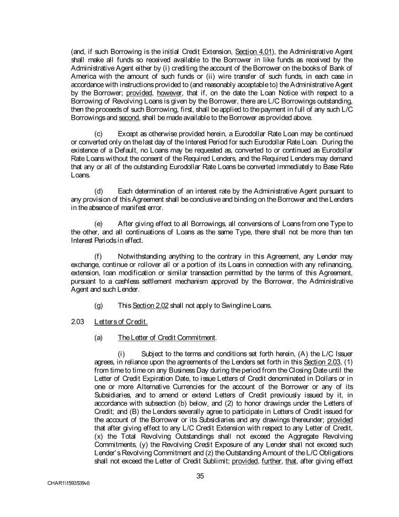 (and, if such Borrowing is the initial Credit Extension, Section 4.01), the Administrative Agent shall make all funds so received available to the Borrower in like funds as received by the Administrative Agent either by (i) crediting the account of the Borrower on the books of Bank of America with the amount of such funds or (ii) wire transfer of such funds, in each case in accordance with instructions provided to (and reasonably acceptable to) the Administrative Agent by the Borrower; provided, however, that if, on the date the Loan Notice with respect to a Borrowing of Revolving Loans is given by the Borrower, there are L/C Borrowings outstanding, then the proceeds of such Borrowing, first, shall be applied to the payment in full of any such L/C Borrowings and second, shall be made available to the Borrower as provided above. (c) Except as otherwise provided herein, a Eurodollar Rate Loan may be continued or converted only on the last day of the Interest Period for such Eurodollar Rate Loan. During the existence of a Default, no Loans may be requested as, converted to or continued as Eurodollar Rate Loans without the consent of the Required Lenders, and the Required Lenders may demand that any or all of the outstanding Eurodollar Rate Loans be converted immediately to Base Rate Loans. (d) Each determination of an interest rate by the Administrative Agent pursuant to any provision of this Agreement shall be conclusive and binding on the Borrower and the Lenders in the absence of manifest error. (e) After giving effect to all Borrowings, all conversions of Loans from one Type to the other, and all continuations of Loans as the same Type, there shall not be more than ten Interest Periods in effect. (f) Notwithstanding anything to the contrary in this Agreement, any Lender may exchange, continue or rollover all or a portion of its Loans in connection with any refinancing, extension, loan modification or similar transaction permitted by the terms of this Agreement, pursuant to a cashless settlement mechanism approved by the Borrower, the Administrative Agent and such Lender. (g) This Section 2.02 shall not apply to Swingline Loans. 2.03 Letters of Credit. (a) The Letter of Credit Commitment. (i) Subject to the terms and conditions set forth herein, (A) the L/C Issuer agrees, in reliance upon the agreements of the Lenders set forth in this Section 2.03, (1) from time to time on any Business Day during the period from the Closing Date until the Letter of Credit Expiration Date, to issue Letters of Credit denominated in Dollars or in one or more Alternative Currencies for the account of the Borrower or any of its Subsidiaries, and to amend or extend Letters of Credit previously issued by it, in accordance with subsection (b) below, and (2) to honor drawings under the Letters of Credit; and (B) the Lenders severally agree to participate in Letters of Credit issued for the account of the Borrower or its Subsidiaries and any drawings thereunder; provided that after giving effect to any L/C Credit Extension with respect to any Letter of Credit, (x) the Total Revolving Outstandings shall not exceed the Aggregate Revolving Commitments, (y) the Revolving Credit Exposure of any Lender shall not exceed such Lender’s Revolving Commitment and (z) the Outstanding Amount of the L/C Obligations shall not exceed the Letter of Credit Sublimit; provided, further, that, after giving effect 35 CHAR1\1593539v8