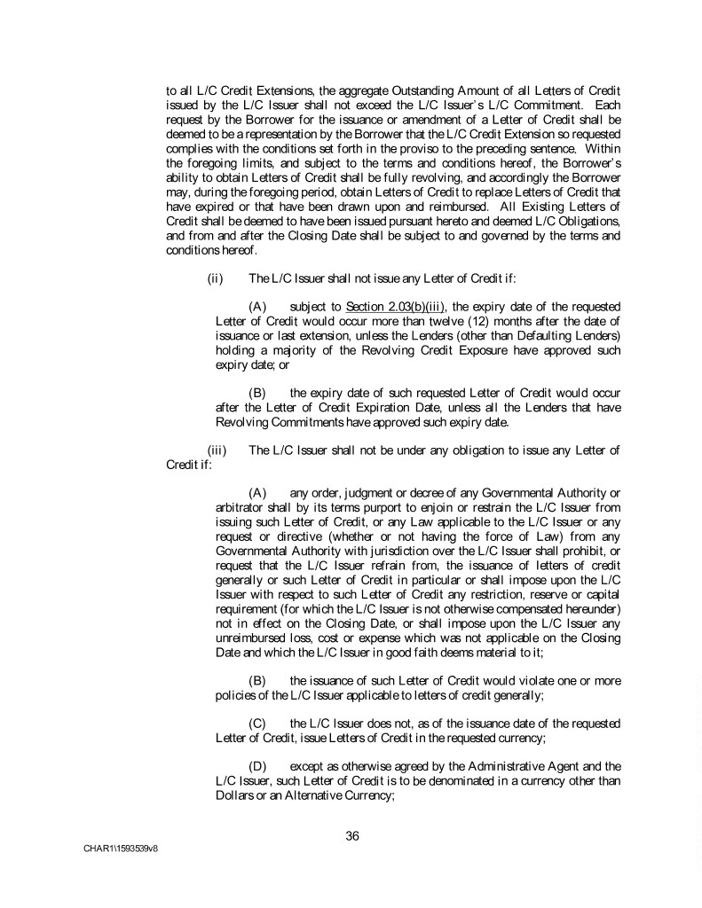 to all L/C Credit Extensions, the aggregate Outstanding Amount of all Letters of Credit issued by the L/C Issuer shall not exceed the L/C Issuer’s L/C Commitment. Each request by the Borrower for the issuance or amendment of a Letter of Credit shall be deemed to be a representation by the Borrower that the L/C Credit Extension so requested complies with the conditions set forth in the proviso to the preceding sentence. Within the foregoing limits, and subject to the terms and conditions hereof, the Borrower’s ability to obtain Letters of Credit shall be fully revolving, and accordingly the Borrower may, during the foregoing period, obtain Letters of Credit to replace Letters of Credit that have expired or that have been drawn upon and reimbursed. All Existing Letters of Credit shall be deemed to have been issued pursuant hereto and deemed L/C Obligations, and from and after the Closing Date shall be subject to and governed by the terms and conditions hereof. (ii) The L/C Issuer shall not issue any Letter of Credit if: (A) subject to Section 2.03(b)(iii), the expiry date of the requested Letter of Credit would occur more than twelve (12) months after the date of issuance or last extension, unless the Lenders (other than Defaulting Lenders) holding a majority of the Revolving Credit Exposure have approved such expiry date; or (B) the expiry date of such requested Letter of Credit would occur after the Letter of Credit Expiration Date, unless all the Lenders that have Revolving Commitments have approved such expiry date. (iii) The L/C Issuer shall not be under any obligation to issue any Letter of Credit if: (A) any order, judgment or decree of any Governmental Authority or arbitrator shall by its terms purport to enjoin or restrain the L/C Issuer from issuing such Letter of Credit, or any Law applicable to the L/C Issuer or any request or directive (whether or not having the force of Law) from any Governmental Authority with jurisdiction over the L/C Issuer shall prohibit, or request that the L/C Issuer refrain from, the issuance of letters of credit generally or such Letter of Credit in particular or shall impose upon the L/C Issuer with respect to such Letter of Credit any restriction, reserve or capital requirement (for which the L/C Issuer is not otherwise compensated hereunder) not in effect on the Closing Date, or shall impose upon the L/C Issuer any unreimbursed loss, cost or expense which was not applicable on the Closing Date and which the L/C Issuer in good faith deems material to it; (B) the issuance of such Letter of Credit would violate one or more policies of the L/C Issuer applicable to letters of credit generally; (C) the L/C Issuer does not, as of the issuance date of the requested Letter of Credit, issue Letters of Credit in the requested currency; (D) except as otherwise agreed by the Administrative Agent and the L/C Issuer, such Letter of Credit is to be denominated in a currency other than Dollars or an Alternative Currency; 36 CHAR1\1593539v8