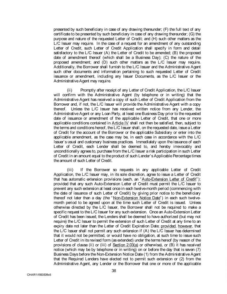 presented by such beneficiary in case of any drawing thereunder; (F) the full text of any certificate to be presented by such beneficiary in case of any drawing thereunder; (G) the purpose and nature of the requested Letter of Credit; and (H) such other matters as the L/C Issuer may require. In the case of a request for an amendment of any outstanding Letter of Credit, such Letter of Credit Application shall specify in form and detail satisfactory to the L/C Issuer (A) the Letter of Credit to be amended; (B) the proposed date of amendment thereof (which shall be a Business Day); (C) the nature of the proposed amendment; and (D) such other matters as the L/C Issuer may require. Additionally, the Borrower shall furnish to the L/C Issuer and the Administrative Agent such other documents and information pertaining to such requested Letter of Credit issuance or amendment, including any Issuer Documents, as the L/C Issuer or the Administrative Agent may require. (ii) Promptly after receipt of any Letter of Credit Application, the L/C Issuer will confirm with the Administrative Agent (by telephone or in writing) that the Administrative Agent has received a copy of such Letter of Credit Application from the Borrower and, if not, the L/C Issuer will provide the Administrative Agent with a copy thereof. Unless the L/C Issuer has received written notice from any Lender, the Administrative Agent or any Loan Party, at least one Business Day prior to the requested date of issuance or amendment of the applicable Letter of Credit, that one or more applicable conditions contained in Article IV shall not then be satisfied, then, subject to the terms and conditions hereof, the L/C Issuer shall, on the requested date, issue a Letter of Credit for the account of the Borrower or the applicable Subsidiary or enter into the applicable amendment, as the case may be, in each case in accordance with the L/C Issuer’s usual and customary business practices. Immediately upon the issuance of each Letter of Credit, each Lender shall be deemed to, and hereby irrevocably and unconditionally agrees to, purchase from the L/C Issuer a risk participation in such Letter of Credit in an amount equal to the product of such Lender’s Applicable Percentage times the amount of such Letter of Credit. (iii) If the Borrower so requests in any applicable Letter of Credit Application, the L/C Issuer may, in its sole discretion, agree to issue a Letter of Credit that has automatic extension provisions (each, an “Auto-Extension Letter of Credit”); provided that any such Auto-Extension Letter of Credit must permit the L/C Issuer to prevent any such extension at least once in each twelve-month period (commencing with the date of issuance of such Letter of Credit) by giving prior notice to the beneficiary thereof not later than a day (the “Non-Extension Notice Date”) in each such twelve- month period to be agreed upon at the time such Letter of Credit is issued. Unless otherwise directed by the L/C Issuer, the Borrower shall not be required to make a specific request to the L/C Issuer for any such extension. Once an Auto-Extension Letter of Credit has been issued, the Lenders shall be deemed to have authorized (but may not require) the L/C Issuer to permit the extension of such Letter of Credit at any time to an expiry date not later than the Letter of Credit Expiration Date; provided, however, that the L/C Issuer shall not permit any such extension if (A) the L/C Issuer has determined that it would not be permitted, or would have no obligation, at such time to issue such Letter of Credit in its revised form (as extended) under the terms hereof (by reason of the provisions of clause (ii) or (iii) of Section 2.03(a) or otherwise), or (B) it has received notice (which may be by telephone or in writing) on or before the day that is seven (7) Business Days before the Non-Extension Notice Date (1) from the Administrative Agent that the Required Lenders have elected not to permit such extension or (2) from the Administrative Agent, any Lender or the Borrower that one or more of the applicable 38 CHAR1\1593539v8