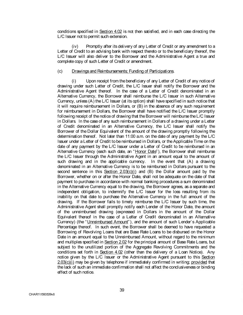 conditions specified in Section 4.02 is not then satisfied, and in each case directing the L/C Issuer not to permit such extension. (iv) Promptly after its delivery of any Letter of Credit or any amendment to a Letter of Credit to an advising bank with respect thereto or to the beneficiary thereof, the L/C Issuer will also deliver to the Borrower and the Administrative Agent a true and complete copy of such Letter of Credit or amendment. (c) Drawings and Reimbursements; Funding of Participations. (i) Upon receipt from the beneficiary of any Letter of Credit of any notice of drawing under such Letter of Credit, the L/C Issuer shall notify the Borrower and the Administrative Agent thereof. In the case of a Letter of Credit denominated in an Alternative Currency, the Borrower shall reimburse the L/C Issuer in such Alternative Currency, unless (A) the L/C Issuer (at its option) shall have specified in such notice that it will require reimbursement in Dollars, or (B) in the absence of any such requirement for reimbursement in Dollars, the Borrower shall have notified the L/C Issuer promptly following receipt of the notice of drawing that the Borrower will reimburse the L/C Issuer in Dollars. In the case of any such reimbursement in Dollars of a drawing under a Letter of Credit denominated in an Alternative Currency, the L/C Issuer shall notify the Borrower of the Dollar Equivalent of the amount of the drawing promptly following the determination thereof. Not later than 11:00 a.m. on the date of any payment by the L/C Issuer under a Letter of Credit to be reimbursed in Dollars, or the Applicable Time on the date of any payment by the L/C Issuer under a Letter of Credit to be reimbursed in an Alternative Currency (each such date, an “Honor Date”), the Borrower shall reimburse the L/C Issuer through the Administrative Agent in an amount equal to the amount of such drawing and in the applicable currency. In the event that (A) a drawing denominated in an Alternative Currency is to be reimbursed in Dollars pursuant to the second sentence in this Section 2.03(c)(i) and (B) the Dollar amount paid by the Borrower, whether on or after the Honor Date, shall not be adequate on the date of that payment to purchase in accordance with normal banking procedures a sum denominated in the Alternative Currency equal to the drawing, the Borrower agrees, as a separate and independent obligation, to indemnify the L/C Issuer for the loss resulting from its inability on that date to purchase the Alternative Currency in the full amount of the drawing. If the Borrower fails to timely reimburse the L/C Issuer by such time, the Administrative Agent shall promptly notify each Lender of the Honor Date, the amount of the unreimbursed drawing (expressed in Dollars in the amount of the Dollar Equivalent thereof in the case of a Letter of Credit denominated in an Alternative Currency) (the “Unreimbursed Amount”), and the amount of such Lender’s Applicable Percentage thereof. In such event, the Borrower shall be deemed to have requested a Borrowing of Revolving Loans that are Base Rate Loans to be disbursed on the Honor Date in an amount equal to the Unreimbursed Amount, without regard to the minimum and multiples specified in Section 2.02 for the principal amount of Base Rate Loans, but subject to the unutilized portion of the Aggregate Revolving Commitments and the conditions set forth in Section 4.02 (other than the delivery of a Loan Notice). Any notice given by the L/C Issuer or the Administrative Agent pursuant to this Section 2.03(c)(i) may be given by telephone if immediately confirmed in writing; provided that the lack of such an immediate confirmation shall not affect the conclusiveness or binding effect of such notice. 39 CHAR1\1593539v8