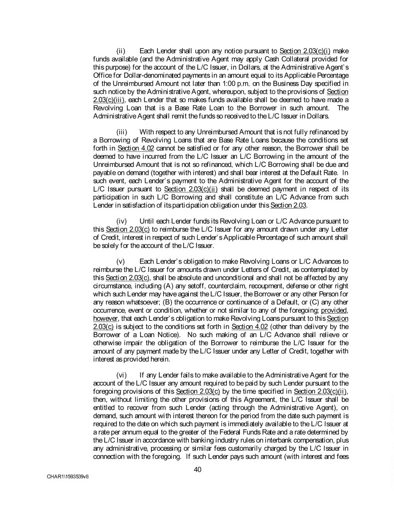 (ii) Each Lender shall upon any notice pursuant to Section 2.03(c)(i) make funds available (and the Administrative Agent may apply Cash Collateral provided for this purpose) for the account of the L/C Issuer, in Dollars, at the Administrative Agent’s Office for Dollar-denominated payments in an amount equal to its Applicable Percentage of the Unreimbursed Amount not later than 1:00 p.m. on the Business Day specified in such notice by the Administrative Agent, whereupon, subject to the provisions of Section 2.03(c)(iii), each Lender that so makes funds available shall be deemed to have made a Revolving Loan that is a Base Rate Loan to the Borrower in such amount. The Administrative Agent shall remit the funds so received to the L/C Issuer in Dollars. (iii) With respect to any Unreimbursed Amount that is not fully refinanced by a Borrowing of Revolving Loans that are Base Rate Loans because the conditions set forth in Section 4.02 cannot be satisfied or for any other reason, the Borrower shall be deemed to have incurred from the L/C Issuer an L/C Borrowing in the amount of the Unreimbursed Amount that is not so refinanced, which L/C Borrowing shall be due and payable on demand (together with interest) and shall bear interest at the Default Rate. In such event, each Lender’s payment to the Administrative Agent for the account of the L/C Issuer pursuant to Section 2.03(c)(ii) shall be deemed payment in respect of its participation in such L/C Borrowing and shall constitute an L/C Advance from such Lender in satisfaction of its participation obligation under this Section 2.03. (iv) Until each Lender funds its Revolving Loan or L/C Advance pursuant to this Section 2.03(c) to reimburse the L/C Issuer for any amount drawn under any Letter of Credit, interest in respect of such Lender’s Applicable Percentage of such amount shall be solely for the account of the L/C Issuer. (v) Each Lender’s obligation to make Revolving Loans or L/C Advances to reimburse the L/C Issuer for amounts drawn under Letters of Credit, as contemplated by this Section 2.03(c), shall be absolute and unconditional and shall not be affected by any circumstance, including (A) any setoff, counterclaim, recoupment, defense or other right which such Lender may have against the L/C Issuer, the Borrower or any other Person for any reason whatsoever; (B) the occurrence or continuance of a Default, or (C) any other occurrence, event or condition, whether or not similar to any of the foregoing; provided, however, that each Lender’s obligation to make Revolving Loans pursuant to this Section 2.03(c) is subject to the conditions set forth in Section 4.02 (other than delivery by the Borrower of a Loan Notice). No such making of an L/C Advance shall relieve or otherwise impair the obligation of the Borrower to reimburse the L/C Issuer for the amount of any payment made by the L/C Issuer under any Letter of Credit, together with interest as provided herein. (vi) If any Lender fails to make available to the Administrative Agent for the account of the L/C Issuer any amount required to be paid by such Lender pursuant to the foregoing provisions of this Section 2.03(c) by the time specified in Section 2.03(c)(ii), then, without limiting the other provisions of this Agreement, the L/C Issuer shall be entitled to recover from such Lender (acting through the Administrative Agent), on demand, such amount with interest thereon for the period from the date such payment is required to the date on which such payment is immediately available to the L/C Issuer at a rate per annum equal to the greater of the Federal Funds Rate and a rate determined by the L/C Issuer in accordance with banking industry rules on interbank compensation, plus any administrative, processing or similar fees customarily charged by the L/C Issuer in connection with the foregoing. If such Lender pays such amount (with interest and fees 40 CHAR1\1593539v8