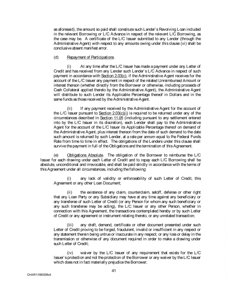 as aforesaid), the amount so paid shall constitute such Lender’s Revolving Loan included in the relevant Borrowing or L/C Advance in respect of the relevant L/C Borrowing, as the case may be. A certificate of the L/C Issuer submitted to any Lender (through the Administrative Agent) with respect to any amounts owing under this clause (vi) shall be conclusive absent manifest error. (d) Repayment of Participations. (i) At any time after the L/C Issuer has made a payment under any Letter of Credit and has received from any Lender such Lender’s L/C Advance in respect of such payment in accordance with Section 2.03(c), if the Administrative Agent receives for the account of the L/C Issuer any payment in respect of the related Unreimbursed Amount or interest thereon (whether directly from the Borrower or otherwise, including proceeds of Cash Collateral applied thereto by the Administrative Agent), the Administrative Agent will distribute to such Lender its Applicable Percentage thereof in Dollars and in the same funds as those received by the Administrative Agent. (ii) If any payment received by the Administrative Agent for the account of the L/C Issuer pursuant to Section 2.03(c)(i) is required to be returned under any of the circumstances described in Section 11.05 (including pursuant to any settlement entered into by the L/C Issuer in its discretion), each Lender shall pay to the Administrative Agent for the account of the L/C Issuer its Applicable Percentage thereof on demand of the Administrative Agent, plus interest thereon from the date of such demand to the date such amount is returned by such Lender, at a rate per annum equal to the Federal Funds Rate from time to time in effect. The obligations of the Lenders under this clause shall survive the payment in full of the Obligations and the termination of this Agreement. (e) Obligations Absolute. The obligation of the Borrower to reimburse the L/C Issuer for each drawing under each Letter of Credit and to repay each L/C Borrowing shall be absolute, unconditional and irrevocable, and shall be paid strictly in accordance with the terms of this Agreement under all circumstances, including the following: (i) any lack of validity or enforceability of such Letter of Credit, this Agreement or any other Loan Document; (ii) the existence of any claim, counterclaim, setoff, defense or other right that any Loan Party or any Subsidiary may have at any time against any beneficiary or any transferee of such Letter of Credit (or any Person for whom any such beneficiary or any such transferee may be acting), the L/C Issuer or any other Person, whether in connection with this Agreement, the transactions contemplated hereby or by such Letter of Credit or any agreement or instrument relating thereto, or any unrelated transaction; (iii) any draft, demand, certificate or other document presented under such Letter of Credit proving to be forged, fraudulent, invalid or insufficient in any respect or any statement therein being untrue or inaccurate in any respect; or any loss or delay in the transmission or otherwise of any document required in order to make a drawing under such Letter of Credit; (iv) waiver by the L/C Issuer of any requirement that exists for the L/C Issuer’s protection and not the protection of the Borrower or any waiver by the L/C Issuer which does not in fact materially prejudice the Borrower; 41 CHAR1\1593539v8