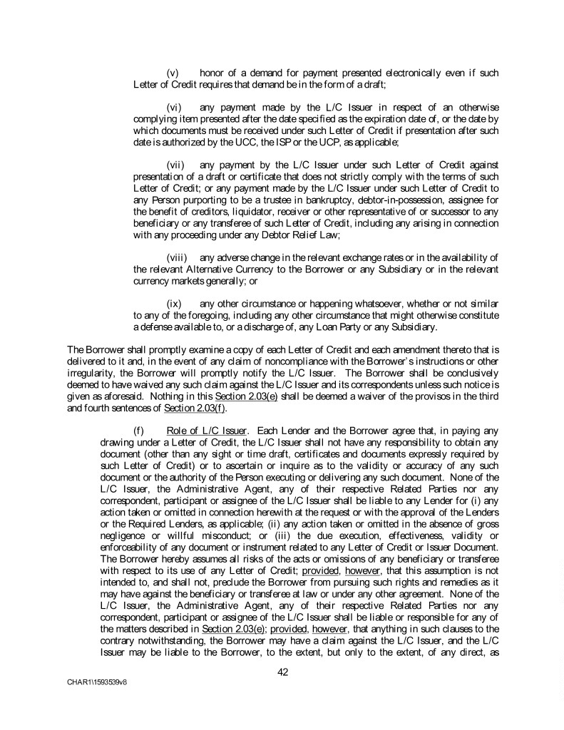 (v) honor of a demand for payment presented electronically even if such Letter of Credit requires that demand be in the form of a draft; (vi) any payment made by the L/C Issuer in respect of an otherwise complying item presented after the date specified as the expiration date of, or the date by which documents must be received under such Letter of Credit if presentation after such date is authorized by the UCC, the ISP or the UCP, as applicable; (vii) any payment by the L/C Issuer under such Letter of Credit against presentation of a draft or certificate that does not strictly comply with the terms of such Letter of Credit; or any payment made by the L/C Issuer under such Letter of Credit to any Person purporting to be a trustee in bankruptcy, debtor-in-possession, assignee for the benefit of creditors, liquidator, receiver or other representative of or successor to any beneficiary or any transferee of such Letter of Credit, including any arising in connection with any proceeding under any Debtor Relief Law; (viii) any adverse change in the relevant exchange rates or in the availability of the relevant Alternative Currency to the Borrower or any Subsidiary or in the relevant currency markets generally; or (ix) any other circumstance or happening whatsoever, whether or not similar to any of the foregoing, including any other circumstance that might otherwise constitute a defense available to, or a discharge of, any Loan Party or any Subsidiary. The Borrower shall promptly examine a copy of each Letter of Credit and each amendment thereto that is delivered to it and, in the event of any claim of noncompliance with the Borrower’s instructions or other irregularity, the Borrower will promptly notify the L/C Issuer. The Borrower shall be conclusively deemed to have waived any such claim against the L/C Issuer and its correspondents unless such notice is given as aforesaid. Nothing in this Section 2.03(e) shall be deemed a waiver of the provisos in the third and fourth sentences of Section 2.03(f). (f) Role of L/C Issuer. Each Lender and the Borrower agree that, in paying any drawing under a Letter of Credit, the L/C Issuer shall not have any responsibility to obtain any document (other than any sight or time draft, certificates and documents expressly required by such Letter of Credit) or to ascertain or inquire as to the validity or accuracy of any such document or the authority of the Person executing or delivering any such document. None of the L/C Issuer, the Administrative Agent, any of their respective Related Parties nor any correspondent, participant or assignee of the L/C Issuer shall be liable to any Lender for (i) any action taken or omitted in connection herewith at the request or with the approval of the Lenders or the Required Lenders, as applicable; (ii) any action taken or omitted in the absence of gross negligence or willful misconduct; or (iii) the due execution, effectiveness, validity or enforceability of any document or instrument related to any Letter of Credit or Issuer Document. The Borrower hereby assumes all risks of the acts or omissions of any beneficiary or transferee with respect to its use of any Letter of Credit; provided, however, that this assumption is not intended to, and shall not, preclude the Borrower from pursuing such rights and remedies as it may have against the beneficiary or transferee at law or under any other agreement. None of the L/C Issuer, the Administrative Agent, any of their respective Related Parties nor any correspondent, participant or assignee of the L/C Issuer shall be liable or responsible for any of the matters described in Section 2.03(e); provided, however, that anything in such clauses to the contrary notwithstanding, the Borrower may have a claim against the L/C Issuer, and the L/C Issuer may be liable to the Borrower, to the extent, but only to the extent, of any direct, as 42 CHAR1\1593539v8