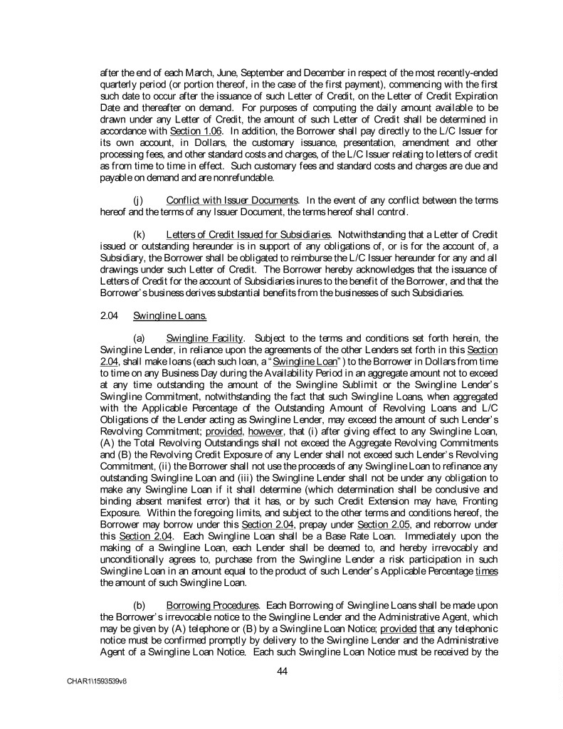 after the end of each March, June, September and December in respect of the most recently-ended quarterly period (or portion thereof, in the case of the first payment), commencing with the first such date to occur after the issuance of such Letter of Credit, on the Letter of Credit Expiration Date and thereafter on demand. For purposes of computing the daily amount available to be drawn under any Letter of Credit, the amount of such Letter of Credit shall be determined in accordance with Section 1.06. In addition, the Borrower shall pay directly to the L/C Issuer for its own account, in Dollars, the customary issuance, presentation, amendment and other processing fees, and other standard costs and charges, of the L/C Issuer relating to letters of credit as from time to time in effect. Such customary fees and standard costs and charges are due and payable on demand and are nonrefundable. (j) Conflict with Issuer Documents. In the event of any conflict between the terms hereof and the terms of any Issuer Document, the terms hereof shall control. (k) Letters of Credit Issued for Subsidiaries. Notwithstanding that a Letter of Credit issued or outstanding hereunder is in support of any obligations of, or is for the account of, a Subsidiary, the Borrower shall be obligated to reimburse the L/C Issuer hereunder for any and all drawings under such Letter of Credit. The Borrower hereby acknowledges that the issuance of Letters of Credit for the account of Subsidiaries inures to the benefit of the Borrower, and that the Borrower’s business derives substantial benefits from the businesses of such Subsidiaries. 2.04 Swingline Loans. (a) Swingline Facility. Subject to the terms and conditions set forth herein, the Swingline Lender, in reliance upon the agreements of the other Lenders set forth in this Section 2.04, shall make loans (each such loan, a “Swingline Loan”) to the Borrower in Dollars from time to time on any Business Day during the Availability Period in an aggregate amount not to exceed at any time outstanding the amount of the Swingline Sublimit or the Swingline Lender’s Swingline Commitment, notwithstanding the fact that such Swingline Loans, when aggregated with the Applicable Percentage of the Outstanding Amount of Revolving Loans and L/C Obligations of the Lender acting as Swingline Lender, may exceed the amount of such Lender’s Revolving Commitment; provided, however, that (i) after giving effect to any Swingline Loan, (A) the Total Revolving Outstandings shall not exceed the Aggregate Revolving Commitments and (B) the Revolving Credit Exposure of any Lender shall not exceed such Lender’s Revolving Commitment, (ii) the Borrower shall not use the proceeds of any Swingline Loan to refinance any outstanding Swingline Loan and (iii) the Swingline Lender shall not be under any obligation to make any Swingline Loan if it shall determine (which determination shall be conclusive and binding absent manifest error) that it has, or by such Credit Extension may have, Fronting Exposure. Within the foregoing limits, and subject to the other terms and conditions hereof, the Borrower may borrow under this Section 2.04, prepay under Section 2.05, and reborrow under this Section 2.04. Each Swingline Loan shall be a Base Rate Loan. Immediately upon the making of a Swingline Loan, each Lender shall be deemed to, and hereby irrevocably and unconditionally agrees to, purchase from the Swingline Lender a risk participation in such Swingline Loan in an amount equal to the product of such Lender’s Applicable Percentage times the amount of such Swingline Loan. (b) Borrowing Procedures. Each Borrowing of Swingline Loans shall be made upon the Borrower’s irrevocable notice to the Swingline Lender and the Administrative Agent, which may be given by (A) telephone or (B) by a Swingline Loan Notice; provided that any telephonic notice must be confirmed promptly by delivery to the Swingline Lender and the Administrative Agent of a Swingline Loan Notice. Each such Swingline Loan Notice must be received by the 44 CHAR1\1593539v8