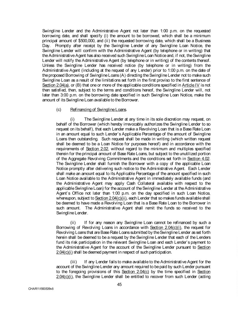 Swingline Lender and the Administrative Agent not later than 1:00 p.m. on the requested borrowing date, and shall specify (i) the amount to be borrowed, which shall be a minimum principal amount of $500,000, and (ii) the requested borrowing date, which shall be a Business Day. Promptly after receipt by the Swingline Lender of any Swingline Loan Notice, the Swingline Lender will confirm with the Administrative Agent (by telephone or in writing) that the Administrative Agent has also received such Swingline Loan Notice and, if not, the Swingline Lender will notify the Administrative Agent (by telephone or in writing) of the contents thereof. Unless the Swingline Lender has received notice (by telephone or in writing) from the Administrative Agent (including at the request of any Lender) prior to 1:00 p.m. on the date of the proposed Borrowing of Swingline Loans (A) directing the Swingline Lender not to make such Swingline Loan as a result of the limitations set forth in the first proviso to the first sentence of Section 2.04(a), or (B) that one or more of the applicable conditions specified in Article IV is not then satisfied, then, subject to the terms and conditions hereof, the Swingline Lender will, not later than 3:00 p.m. on the borrowing date specified in such Swingline Loan Notice, make the amount of its Swingline Loan available to the Borrower. (c) Refinancing of Swingline Loans. (i) The Swingline Lender at any time in its sole discretion may request, on behalf of the Borrower (which hereby irrevocably authorizes the Swingline Lender to so request on its behalf), that each Lender make a Revolving Loan that is a Base Rate Loan in an amount equal to such Lender’s Applicable Percentage of the amount of Swingline Loans then outstanding. Such request shall be made in writing (which written request shall be deemed to be a Loan Notice for purposes hereof) and in accordance with the requirements of Section 2.02, without regard to the minimum and multiples specified therein for the principal amount of Base Rate Loans, but subject to the unutilized portion of the Aggregate Revolving Commitments and the conditions set forth in Section 4.02. The Swingline Lender shall furnish the Borrower with a copy of the applicable Loan Notice promptly after delivering such notice to the Administrative Agent. Each Lender shall make an amount equal to its Applicable Percentage of the amount specified in such Loan Notice available to the Administrative Agent in immediately available funds (and the Administrative Agent may apply Cash Collateral available with respect to the applicable Swingline Loan) for the account of the Swingline Lender at the Administrative Agent’s Office not later than 1:00 p.m. on the day specified in such Loan Notice, whereupon, subject to Section 2.04(c)(ii), each Lender that so makes funds available shall be deemed to have made a Revolving Loan that is a Base Rate Loan to the Borrower in such amount. The Administrative Agent shall remit the funds so received to the Swingline Lender. (ii) If for any reason any Swingline Loan cannot be refinanced by such a Borrowing of Revolving Loans in accordance with Section 2.04(c)(i), the request for Revolving Loans that are Base Rate Loans submitted by the Swingline Lender as set forth herein shall be deemed to be a request by the Swingline Lender that each of the Lenders fund its risk participation in the relevant Swingline Loan and each Lender’s payment to the Administrative Agent for the account of the Swingline Lender pursuant to Section 2.04(c)(i) shall be deemed payment in respect of such participation. (iii) If any Lender fails to make available to the Administrative Agent for the account of the Swingline Lender any amount required to be paid by such Lender pursuant to the foregoing provisions of this Section 2.04(c) by the time specified in Section 2.04(c)(i), the Swingline Lender shall be entitled to recover from such Lender (acting 45 CHAR1\1593539v8
