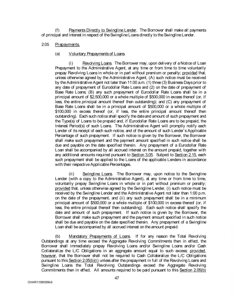 (f) Payments Directly to Swingline Lender. The Borrower shall make all payments of principal and interest in respect of the Swingline Loans directly to the Swingline Lender. 2.05 Prepayments. (a) Voluntary Prepayments of Loans. (i) Revolving Loans. The Borrower may, upon delivery of a Notice of Loan Prepayment to the Administrative Agent, at any time or from time to time voluntarily prepay Revolving Loans in whole or in part without premium or penalty; provided that, unless otherwise agreed by the Administrative Agent, (A) such notice must be received by the Administrative Agent not later than 11:00 a.m. (1) three (3) Business Days prior to any date of prepayment of Eurodollar Rate Loans and (2) on the date of prepayment of Base Rate Loans; (B) any such prepayment of Eurodollar Rate Loans shall be in a principal amount of $2,500,000 or a whole multiple of $500,000 in excess thereof (or, if less, the entire principal amount thereof then outstanding); and (C) any prepayment of Base Rate Loans shall be in a principal amount of $500,000 or a whole multiple of $100,000 in excess thereof (or, if less, the entire principal amount thereof then outstanding). Each such notice shall specify the date and amount of such prepayment and the Type(s) of Loans to be prepaid and, if Eurodollar Rate Loans are to be prepaid, the Interest Period(s) of such Loans. The Administrative Agent will promptly notify each Lender of its receipt of each such notice, and of the amount of such Lender’s Applicable Percentage of such prepayment. If such notice is given by the Borrower, the Borrower shall make such prepayment and the payment amount specified in such notice shall be due and payable on the date specified therein. Any prepayment of a Eurodollar Rate Loan shall be accompanied by all accrued interest on the amount prepaid, together with any additional amounts required pursuant to Section 3.05. Subject to Section 2.15, each such prepayment shall be applied to the Loans of the applicable Lenders in accordance with their respective Applicable Percentages. (ii) Swingline Loans. The Borrower may, upon notice to the Swingline Lender (with a copy to the Administrative Agent), at any time or from time to time, voluntarily prepay Swingline Loans in whole or in part without premium or penalty; provided that, unless otherwise agreed by the Swingline Lender, (i) such notice must be received by the Swingline Lender and the Administrative Agent not later than 1:00 p.m. on the date of the prepayment, and (ii) any such prepayment shall be in a minimum principal amount of $500,000 or a whole multiple of $100,000 in excess thereof (or, if less, the entire principal thereof then outstanding). Each such notice shall specify the date and amount of such prepayment. If such notice is given by the Borrower, the Borrower shall make such prepayment and the payment amount specified in such notice shall be due and payable on the date specified therein. Any prepayment of a Swingline Loan shall be accompanied by all accrued interest on the amount prepaid. (b) Mandatory Prepayments of Loans. If for any reason the Total Revolving Outstandings at any time exceed the Aggregate Revolving Commitments then in effect, the Borrower shall immediately prepay Revolving Loans and/or Swingline Loans and/or Cash Collateralize the L/C Obligations in an aggregate amount equal to such excess; provided, however, that the Borrower shall not be required to Cash Collateralize the L/C Obligations pursuant to this Section 2.05(b)(i) unless after the prepayment in full of the Revolving Loans and Swingline Loans the Total Revolving Outstandings exceed the Aggregate Revolving Commitments then in effect. All amounts required to be paid pursuant to this Section 2.05(b) 47 CHAR1\1593539v8