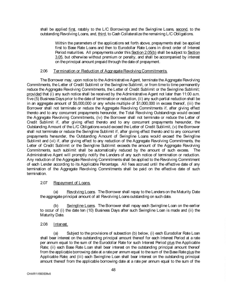 shall be applied first, ratably to the L/C Borrowings and the Swingline Loans, second, to the outstanding Revolving Loans, and, third, to Cash Collateralize the remaining L/C Obligations. Within the parameters of the applications set forth above, prepayments shall be applied first to Base Rate Loans and then to Eurodollar Rate Loans in direct order of Interest Period maturities. All prepayments under this Section 2.05(b) shall be subject to Section 3.05, but otherwise without premium or penalty, and shall be accompanied by interest on the principal amount prepaid through the date of prepayment. 2.06 Termination or Reduction of Aggregate Revolving Commitments. The Borrower may, upon notice to the Administrative Agent, terminate the Aggregate Revolving Commitments, the Letter of Credit Sublimit or the Swingline Sublimit, or from time to time permanently reduce the Aggregate Revolving Commitments, the Letter of Credit Sublimit or the Swingline Sublimit; provided that (i) any such notice shall be received by the Administrative Agent not later than 11:00 a.m. five (5) Business Days prior to the date of termination or reduction, (ii) any such partial reduction shall be in an aggregate amount of $5,000,000 or any whole multiple of $1,000,000 in excess thereof, (iii) the Borrower shall not terminate or reduce the Aggregate Revolving Commitments if, after giving effect thereto and to any concurrent prepayments hereunder, the Total Revolving Outstandings would exceed the Aggregate Revolving Commitments, (iv) the Borrower shall not terminate or reduce the Letter of Credit Sublimit if, after giving effect thereto and to any concurrent prepayments hereunder, the Outstanding Amount of the L/C Obligations would exceed the Letter of Credit Sublimit, (v) the Borrower shall not terminate or reduce the Swingline Sublimit if, after giving effect thereto and to any concurrent prepayments hereunder, the Outstanding Amount of Swingline Loans would exceed the Swingline Sublimit and (vi) if, after giving effect to any reduction of the Aggregate Revolving Commitments, the Letter of Credit Sublimit or the Swingline Sublimit exceeds the amount of the Aggregate Revolving Commitments, such sublimit shall be automatically reduced by the amount of such excess. The Administrative Agent will promptly notify the Lenders of any such notice of termination or reduction. Any reduction of the Aggregate Revolving Commitments shall be applied to the Revolving Commitment of each Lender according to its Applicable Percentage. All fees accrued until the effective date of any termination of the Aggregate Revolving Commitments shall be paid on the effective date of such termination. 2.07 Repayment of Loans. (a) Revolving Loans. The Borrower shall repay to the Lenders on the Maturity Date the aggregate principal amount of all Revolving Loans outstanding on such date. (b) Swingline Loans. The Borrower shall repay each Swingline Loan on the earlier to occur of (i) the date ten (10) Business Days after such Swingline Loan is made and (ii) the Maturity Date. 2.08 Interest. (a) Subject to the provisions of subsection (b) below, (i) each Eurodollar Rate Loan shall bear interest on the outstanding principal amount thereof for each Interest Period at a rate per annum equal to the sum of the Eurodollar Rate for such Interest Period plus the Applicable Rate; (ii) each Base Rate Loan shall bear interest on the outstanding principal amount thereof from the applicable borrowing date at a rate per annum equal to the sum of the Base Rate plus the Applicable Rate; and (iii) each Swingline Loan shall bear interest on the outstanding principal amount thereof from the applicable borrowing date at a rate per annum equal to the sum of the 48 CHAR1\1593539v8