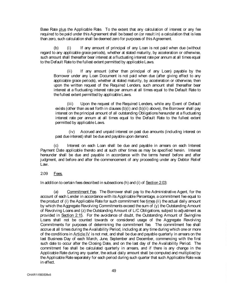 Base Rate plus the Applicable Rate. To the extent that any calculation of interest or any fee required to be paid under this Agreement shall be based on (or result in) a calculation that is less than zero, such calculation shall be deemed zero for purposes of this Agreement. (b) (i) If any amount of principal of any Loan is not paid when due (without regard to any applicable grace periods), whether at stated maturity, by acceleration or otherwise, such amount shall thereafter bear interest at a fluctuating interest rate per annum at all times equal to the Default Rate to the fullest extent permitted by applicable Laws. (ii) If any amount (other than principal of any Loan) payable by the Borrower under any Loan Document is not paid when due (after giving effect to any applicable grace periods), whether at stated maturity, by acceleration or otherwise, then upon the written request of the Required Lenders, such amount shall thereafter bear interest at a fluctuating interest rate per annum at all times equal to the Default Rate to the fullest extent permitted by applicable Laws. (iii) Upon the request of the Required Lenders, while any Event of Default exists (other than as set forth in clauses (b)(i) and (b)(ii) above), the Borrower shall pay interest on the principal amount of all outstanding Obligations hereunder at a fluctuating interest rate per annum at all times equal to the Default Rate to the fullest extent permitted by applicable Laws. (iv) Accrued and unpaid interest on past due amounts (including interest on past due interest) shall be due and payable upon demand. (c) Interest on each Loan shall be due and payable in arrears on each Interest Payment Date applicable thereto and at such other times as may be specified herein. Interest hereunder shall be due and payable in accordance with the terms hereof before and after judgment, and before and after the commencement of any proceeding under any Debtor Relief Law. 2.09 Fees. In addition to certain fees described in subsections (h) and (i) of Section 2.03: (a) Commitment Fee. The Borrower shall pay to the Administrative Agent, for the account of each Lender in accordance with its Applicable Percentage, a commitment fee equal to the product of (i) the Applicable Rate for such commitment fee times (ii) the actual daily amount by which the Aggregate Revolving Commitments exceed the sum of (y) the Outstanding Amount of Revolving Loans and (z) the Outstanding Amount of L/C Obligations, subject to adjustment as provided in Section 2.15. For the avoidance of doubt, the Outstanding Amount of Swingline Loans shall not be counted towards or considered usage of the Aggregate Revolving Commitments for purposes of determining the commitment fee. The commitment fee shall accrue at all times during the Availability Period, including at any time during which one or more of the conditions in Article IV is not met, and shall be due and payable quarterly in arrears on the last Business Day of each March, June, September and December, commencing with the first such date to occur after the Closing Date, and on the last day of the Availability Period. The commitment fee shall be calculated quarterly in arrears, and if there is any change in the Applicable Rate during any quarter, the actual daily amount shall be computed and multiplied by the Applicable Rate separately for each period during such quarter that such Applicable Rate was in effect. 49 CHAR1\1593539v8