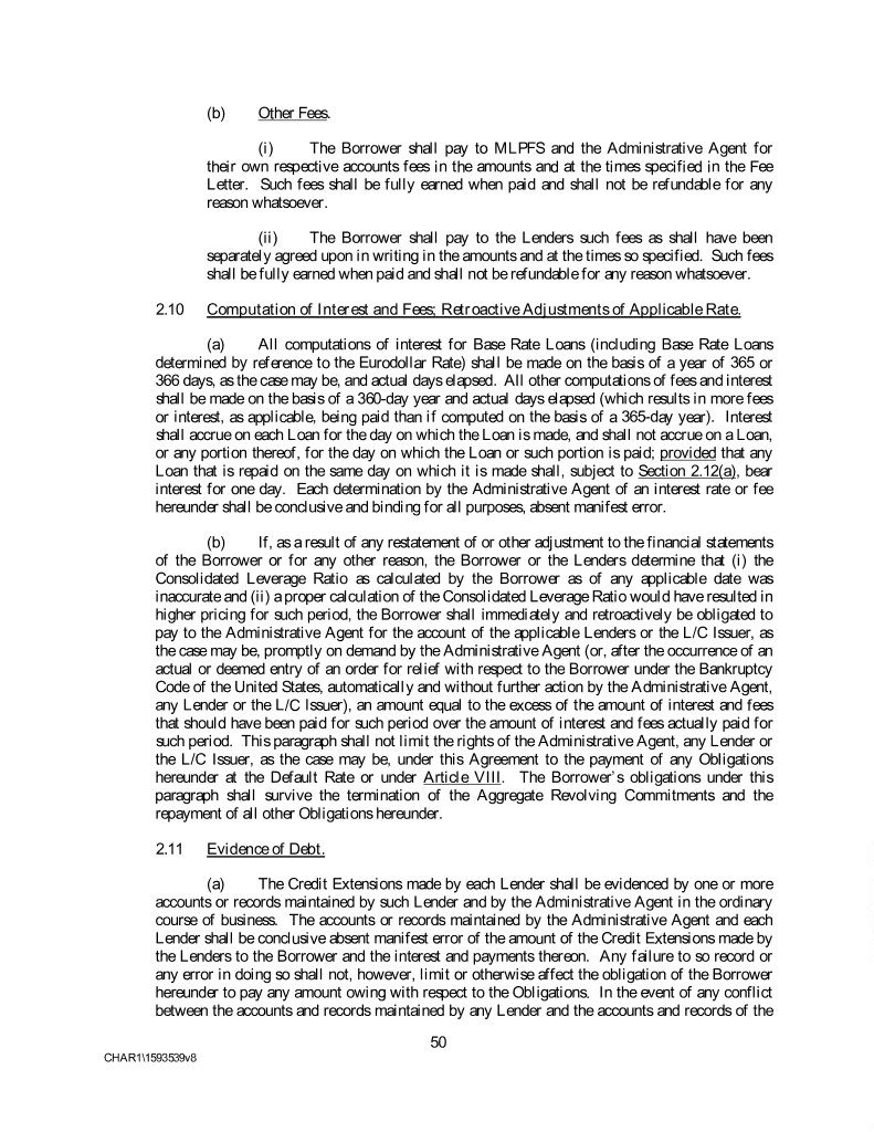 (b) Other Fees. (i) The Borrower shall pay to MLPFS and the Administrative Agent for their own respective accounts fees in the amounts and at the times specified in the Fee Letter. Such fees shall be fully earned when paid and shall not be refundable for any reason whatsoever. (ii) The Borrower shall pay to the Lenders such fees as shall have been separately agreed upon in writing in the amounts and at the times so specified. Such fees shall be fully earned when paid and shall not be refundable for any reason whatsoever. 2.10 Computation of Interest and Fees; Retroactive Adjustments of Applicable Rate. (a) All computations of interest for Base Rate Loans (including Base Rate Loans determined by reference to the Eurodollar Rate) shall be made on the basis of a year of 365 or 366 days, as the case may be, and actual days elapsed. All other computations of fees and interest shall be made on the basis of a 360-day year and actual days elapsed (which results in more fees or interest, as applicable, being paid than if computed on the basis of a 365-day year). Interest shall accrue on each Loan for the day on which the Loan is made, and shall not accrue on a Loan, or any portion thereof, for the day on which the Loan or such portion is paid; provided that any Loan that is repaid on the same day on which it is made shall, subject to Section 2.12(a), bear interest for one day. Each determination by the Administrative Agent of an interest rate or fee hereunder shall be conclusive and binding for all purposes, absent manifest error. (b) If, as a result of any restatement of or other adjustment to the financial statements of the Borrower or for any other reason, the Borrower or the Lenders determine that (i) the Consolidated Leverage Ratio as calculated by the Borrower as of any applicable date was inaccurate and (ii) a proper calculation of the Consolidated Leverage Ratio would have resulted in higher pricing for such period, the Borrower shall immediately and retroactively be obligated to pay to the Administrative Agent for the account of the applicable Lenders or the L/C Issuer, as the case may be, promptly on demand by the Administrative Agent (or, after the occurrence of an actual or deemed entry of an order for relief with respect to the Borrower under the Bankruptcy Code of the United States, automatically and without further action by the Administrative Agent, any Lender or the L/C Issuer), an amount equal to the excess of the amount of interest and fees that should have been paid for such period over the amount of interest and fees actually paid for such period. This paragraph shall not limit the rights of the Administrative Agent, any Lender or the L/C Issuer, as the case may be, under this Agreement to the payment of any Obligations hereunder at the Default Rate or under Article VIII. The Borrower’s obligations under this paragraph shall survive the termination of the Aggregate Revolving Commitments and the repayment of all other Obligations hereunder. 2.11 Evidence of Debt. (a) The Credit Extensions made by each Lender shall be evidenced by one or more accounts or records maintained by such Lender and by the Administrative Agent in the ordinary course of business. The accounts or records maintained by the Administrative Agent and each Lender shall be conclusive absent manifest error of the amount of the Credit Extensions made by the Lenders to the Borrower and the interest and payments thereon. Any failure to so record or any error in doing so shall not, however, limit or otherwise affect the obligation of the Borrower hereunder to pay any amount owing with respect to the Obligations. In the event of any conflict between the accounts and records maintained by any Lender and the accounts and records of the 50 CHAR1\1593539v8