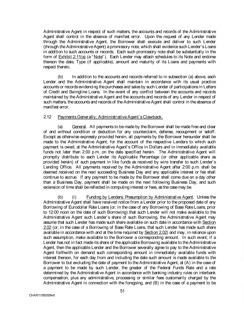 Administrative Agent in respect of such matters, the accounts and records of the Administrative Agent shall control in the absence of manifest error. Upon the request of any Lender made through the Administrative Agent, the Borrower shall execute and deliver to such Lender (through the Administrative Agent) a promissory note, which shall evidence such Lender’s Loans in addition to such accounts or records. Each such promissory note shall be substantially in the form of Exhibit 2.11(a) (a “Note”). Each Lender may attach schedules to its Note and endorse thereon the date, Type (if applicable), amount and maturity of its Loans and payments with respect thereto. (b) In addition to the accounts and records referred to in subsection (a) above, each Lender and the Administrative Agent shall maintain in accordance with its usual practice accounts or records evidencing the purchases and sales by such Lender of participations in Letters of Credit and Swingline Loans. In the event of any conflict between the accounts and records maintained by the Administrative Agent and the accounts and records of any Lender in respect of such matters, the accounts and records of the Administrative Agent shall control in the absence of manifest error. 2.12 Payments Generally; Administrative Agent’s Clawback. (a) General. All payments to be made by the Borrower shall be made free and clear of and without condition or deduction for any counterclaim, defense, recoupment or setoff. Except as otherwise expressly provided herein, all payments by the Borrower hereunder shall be made to the Administrative Agent, for the account of the respective Lenders to which such payment is owed, at the Administrative Agent’s Office in Dollars and in immediately available funds not later than 2:00 p.m. on the date specified herein. The Administrative Agent will promptly distribute to each Lender its Applicable Percentage (or other applicable share as provided herein) of such payment in like funds as received by wire transfer to such Lender’s Lending Office. All payments received by the Administrative Agent after 2:00 p.m. shall be deemed received on the next succeeding Business Day and any applicable interest or fee shall continue to accrue. If any payment to be made by the Borrower shall come due on a day other than a Business Day, payment shall be made on the next following Business Day, and such extension of time shall be reflected in computing interest or fees, as the case may be. (b) (i) Funding by Lenders; Presumption by Administrative Agent. Unless the Administrative Agent shall have received notice from a Lender prior to the proposed date of any Borrowing of Eurodollar Rate Loans (or, in the case of any Borrowing of Base Rate Loans, prior to 12:00 noon on the date of such Borrowing) that such Lender will not make available to the Administrative Agent such Lender’s share of such Borrowing, the Administrative Agent may assume that such Lender has made such share available on such date in accordance with Section 2.02 (or, in the case of a Borrowing of Base Rate Loans, that such Lender has made such share available in accordance with and at the time required by Section 2.02) and may, in reliance upon such assumption, make available to the Borrower a corresponding amount. In such event, if a Lender has not in fact made its share of the applicable Borrowing available to the Administrative Agent, then the applicable Lender and the Borrower severally agree to pay to the Administrative Agent forthwith on demand such corresponding amount in immediately available funds with interest thereon, for each day from and including the date such amount is made available to the Borrower to but excluding the date of payment to the Administrative Agent, at (A) in the case of a payment to be made by such Lender, the greater of the Federal Funds Rate and a rate determined by the Administrative Agent in accordance with banking industry rules on interbank compensation, plus any administrative, processing or similar fees customarily charged by the Administrative Agent in connection with the foregoing, and (B) in the case of a payment to be 51 CHAR1\1593539v8