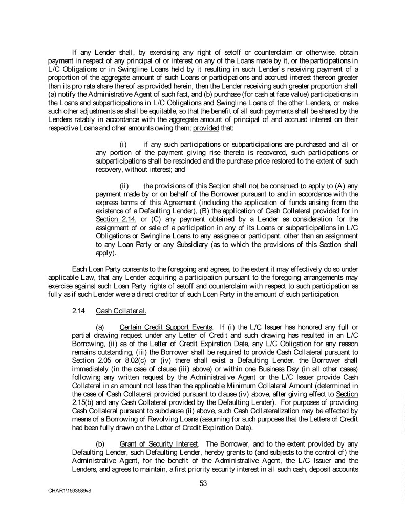 If any Lender shall, by exercising any right of setoff or counterclaim or otherwise, obtain payment in respect of any principal of or interest on any of the Loans made by it, or the participations in L/C Obligations or in Swingline Loans held by it resulting in such Lender’s receiving payment of a proportion of the aggregate amount of such Loans or participations and accrued interest thereon greater than its pro rata share thereof as provided herein, then the Lender receiving such greater proportion shall (a) notify the Administrative Agent of such fact, and (b) purchase (for cash at face value) participations in the Loans and subparticipations in L/C Obligations and Swingline Loans of the other Lenders, or make such other adjustments as shall be equitable, so that the benefit of all such payments shall be shared by the Lenders ratably in accordance with the aggregate amount of principal of and accrued interest on their respective Loans and other amounts owing them; provided that: (i) if any such participations or subparticipations are purchased and all or any portion of the payment giving rise thereto is recovered, such participations or subparticipations shall be rescinded and the purchase price restored to the extent of such recovery, without interest; and (ii) the provisions of this Section shall not be construed to apply to (A) any payment made by or on behalf of the Borrower pursuant to and in accordance with the express terms of this Agreement (including the application of funds arising from the existence of a Defaulting Lender), (B) the application of Cash Collateral provided for in Section 2.14, or (C) any payment obtained by a Lender as consideration for the assignment of or sale of a participation in any of its Loans or subparticipations in L/C Obligations or Swingline Loans to any assignee or participant, other than an assignment to any Loan Party or any Subsidiary (as to which the provisions of this Section shall apply). Each Loan Party consents to the foregoing and agrees, to the extent it may effectively do so under applicable Law, that any Lender acquiring a participation pursuant to the foregoing arrangements may exercise against such Loan Party rights of setoff and counterclaim with respect to such participation as fully as if such Lender were a direct creditor of such Loan Party in the amount of such participation. 2.14 Cash Collateral. (a) Certain Credit Support Events. If (i) the L/C Issuer has honored any full or partial drawing request under any Letter of Credit and such drawing has resulted in an L/C Borrowing, (ii) as of the Letter of Credit Expiration Date, any L/C Obligation for any reason remains outstanding, (iii) the Borrower shall be required to provide Cash Collateral pursuant to Section 2.05 or 8.02(c) or (iv) there shall exist a Defaulting Lender, the Borrower shall immediately (in the case of clause (iii) above) or within one Business Day (in all other cases) following any written request by the Administrative Agent or the L/C Issuer provide Cash Collateral in an amount not less than the applicable Minimum Collateral Amount (determined in the case of Cash Collateral provided pursuant to clause (iv) above, after giving effect to Section 2.15(b) and any Cash Collateral provided by the Defaulting Lender). For purposes of providing Cash Collateral pursuant to subclause (ii) above, such Cash Collateralization may be effected by means of a Borrowing of Revolving Loans (assuming for such purposes that the Letters of Credit had been fully drawn on the Letter of Credit Expiration Date). (b) Grant of Security Interest. The Borrower, and to the extent provided by any Defaulting Lender, such Defaulting Lender, hereby grants to (and subjects to the control of) the Administrative Agent, for the benefit of the Administrative Agent, the L/C Issuer and the Lenders, and agrees to maintain, a first priority security interest in all such cash, deposit accounts 53 CHAR1\1593539v8