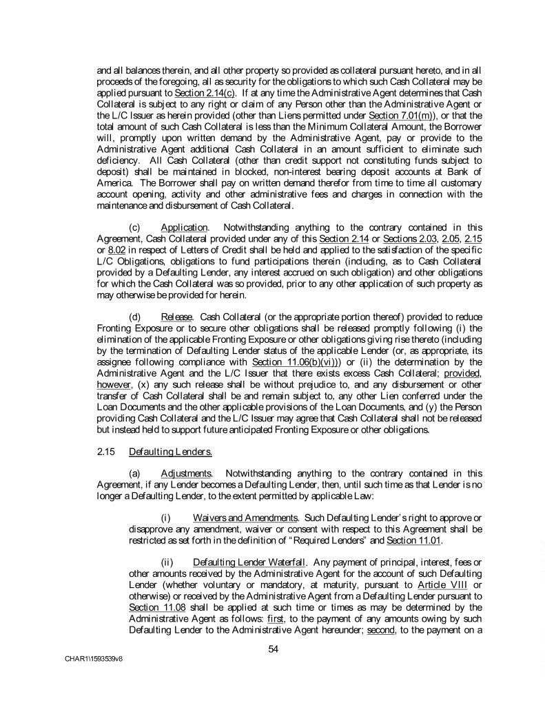 and all balances therein, and all other property so provided as collateral pursuant hereto, and in all proceeds of the foregoing, all as security for the obligations to which such Cash Collateral may be applied pursuant to Section 2.14(c). If at any time the Administrative Agent determines that Cash Collateral is subject to any right or claim of any Person other than the Administrative Agent or the L/C Issuer as herein provided (other than Liens permitted under Section 7.01(m)), or that the total amount of such Cash Collateral is less than the Minimum Collateral Amount, the Borrower will, promptly upon written demand by the Administrative Agent, pay or provide to the Administrative Agent additional Cash Collateral in an amount sufficient to eliminate such deficiency. All Cash Collateral (other than credit support not constituting funds subject to deposit) shall be maintained in blocked, non-interest bearing deposit accounts at Bank of America. The Borrower shall pay on written demand therefor from time to time all customary account opening, activity and other administrative fees and charges in connection with the maintenance and disbursement of Cash Collateral. (c) Application. Notwithstanding anything to the contrary contained in this Agreement, Cash Collateral provided under any of this Section 2.14 or Sections 2.03, 2.05, 2.15 or 8.02 in respect of Letters of Credit shall be held and applied to the satisfaction of the specific L/C Obligations, obligations to fund participations therein (including, as to Cash Collateral provided by a Defaulting Lender, any interest accrued on such obligation) and other obligations for which the Cash Collateral was so provided, prior to any other application of such property as may otherwise be provided for herein. (d) Release. Cash Collateral (or the appropriate portion thereof) provided to reduce Fronting Exposure or to secure other obligations shall be released promptly following (i) the elimination of the applicable Fronting Exposure or other obligations giving rise thereto (including by the termination of Defaulting Lender status of the applicable Lender (or, as appropriate, its assignee following compliance with Section 11.06(b)(vi))) or (ii) the determination by the Administrative Agent and the L/C Issuer that there exists excess Cash Collateral; provided, however, (x) any such release shall be without prejudice to, and any disbursement or other transfer of Cash Collateral shall be and remain subject to, any other Lien conferred under the Loan Documents and the other applicable provisions of the Loan Documents, and (y) the Person providing Cash Collateral and the L/C Issuer may agree that Cash Collateral shall not be released but instead held to support future anticipated Fronting Exposure or other obligations. 2.15 Defaulting Lenders. (a) Adjustments. Notwithstanding anything to the contrary contained in this Agreement, if any Lender becomes a Defaulting Lender, then, until such time as that Lender is no longer a Defaulting Lender, to the extent permitted by applicable Law: (i) Waivers and Amendments. Such Defaulting Lender’s right to approve or disapprove any amendment, waiver or consent with respect to this Agreement shall be restricted as set forth in the definition of “Required Lenders” and Section 11.01. (ii) Defaulting Lender Waterfall. Any payment of principal, interest, fees or other amounts received by the Administrative Agent for the account of such Defaulting Lender (whether voluntary or mandatory, at maturity, pursuant to Article VIII or otherwise) or received by the Administrative Agent from a Defaulting Lender pursuant to Section 11.08 shall be applied at such time or times as may be determined by the Administrative Agent as follows: first, to the payment of any amounts owing by such Defaulting Lender to the Administrative Agent hereunder; second, to the payment on a 54 CHAR1\1593539v8
