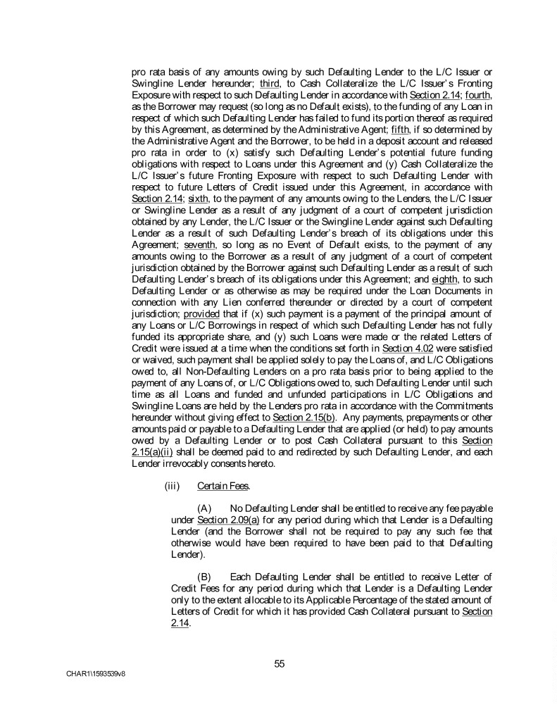 pro rata basis of any amounts owing by such Defaulting Lender to the L/C Issuer or Swingline Lender hereunder; third, to Cash Collateralize the L/C Issuer’s Fronting Exposure with respect to such Defaulting Lender in accordance with Section 2.14; fourth, as the Borrower may request (so long as no Default exists), to the funding of any Loan in respect of which such Defaulting Lender has failed to fund its portion thereof as required by this Agreement, as determined by the Administrative Agent; fifth, if so determined by the Administrative Agent and the Borrower, to be held in a deposit account and released pro rata in order to (x) satisfy such Defaulting Lender’s potential future funding obligations with respect to Loans under this Agreement and (y) Cash Collateralize the L/C Issuer’s future Fronting Exposure with respect to such Defaulting Lender with respect to future Letters of Credit issued under this Agreement, in accordance with Section 2.14; sixth, to the payment of any amounts owing to the Lenders, the L/C Issuer or Swingline Lender as a result of any judgment of a court of competent jurisdiction obtained by any Lender, the L/C Issuer or the Swingline Lender against such Defaulting Lender as a result of such Defaulting Lender’s breach of its obligations under this Agreement; seventh, so long as no Event of Default exists, to the payment of any amounts owing to the Borrower as a result of any judgment of a court of competent jurisdiction obtained by the Borrower against such Defaulting Lender as a result of such Defaulting Lender’s breach of its obligations under this Agreement; and eighth, to such Defaulting Lender or as otherwise as may be required under the Loan Documents in connection with any Lien conferred thereunder or directed by a court of competent jurisdiction; provided that if (x) such payment is a payment of the principal amount of any Loans or L/C Borrowings in respect of which such Defaulting Lender has not fully funded its appropriate share, and (y) such Loans were made or the related Letters of Credit were issued at a time when the conditions set forth in Section 4.02 were satisfied or waived, such payment shall be applied solely to pay the Loans of, and L/C Obligations owed to, all Non-Defaulting Lenders on a pro rata basis prior to being applied to the payment of any Loans of, or L/C Obligations owed to, such Defaulting Lender until such time as all Loans and funded and unfunded participations in L/C Obligations and Swingline Loans are held by the Lenders pro rata in accordance with the Commitments hereunder without giving effect to Section 2.15(b). Any payments, prepayments or other amounts paid or payable to a Defaulting Lender that are applied (or held) to pay amounts owed by a Defaulting Lender or to post Cash Collateral pursuant to this Section 2.15(a)(ii) shall be deemed paid to and redirected by such Defaulting Lender, and each Lender irrevocably consents hereto. (iii) Certain Fees. (A) No Defaulting Lender shall be entitled to receive any fee payable under Section 2.09(a) for any period during which that Lender is a Defaulting Lender (and the Borrower shall not be required to pay any such fee that otherwise would have been required to have been paid to that Defaulting Lender). (B) Each Defaulting Lender shall be entitled to receive Letter of Credit Fees for any period during which that Lender is a Defaulting Lender only to the extent allocable to its Applicable Percentage of the stated amount of Letters of Credit for which it has provided Cash Collateral pursuant to Section 2.14. 55 CHAR1\1593539v8