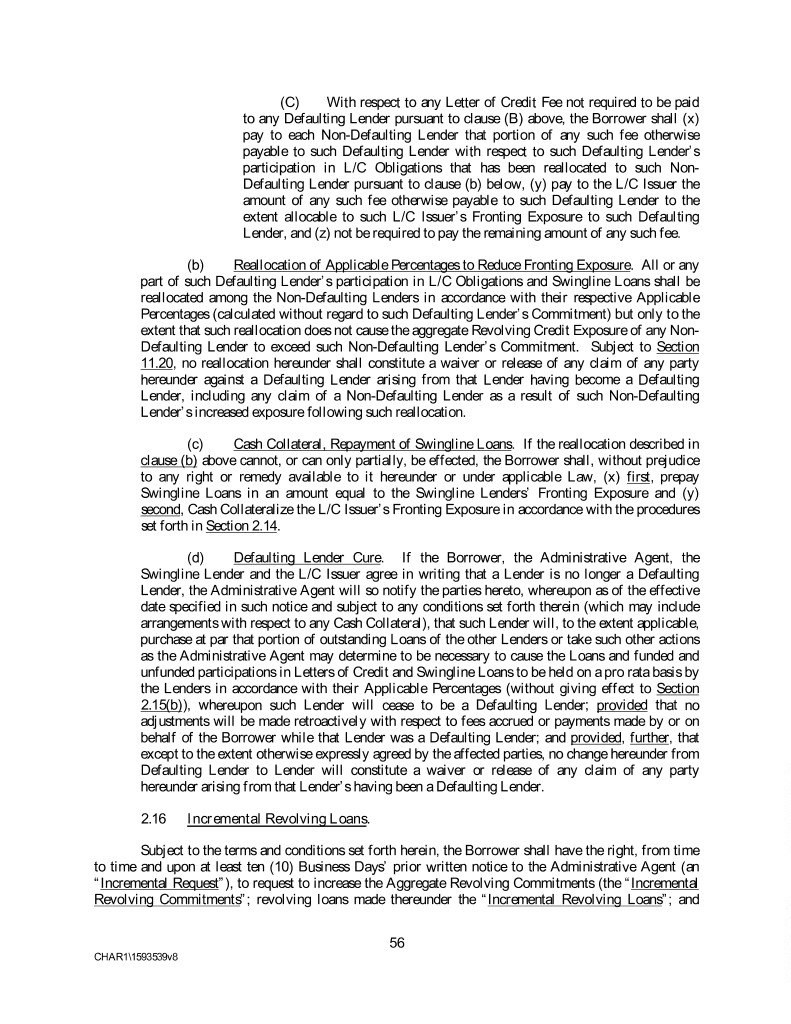 (C) With respect to any Letter of Credit Fee not required to be paid to any Defaulting Lender pursuant to clause (B) above, the Borrower shall (x) pay to each Non-Defaulting Lender that portion of any such fee otherwise payable to such Defaulting Lender with respect to such Defaulting Lender’s participation in L/C Obligations that has been reallocated to such Non- Defaulting Lender pursuant to clause (b) below, (y) pay to the L/C Issuer the amount of any such fee otherwise payable to such Defaulting Lender to the extent allocable to such L/C Issuer’s Fronting Exposure to such Defaulting Lender, and (z) not be required to pay the remaining amount of any such fee. (b) Reallocation of Applicable Percentages to Reduce Fronting Exposure. All or any part of such Defaulting Lender’s participation in L/C Obligations and Swingline Loans shall be reallocated among the Non-Defaulting Lenders in accordance with their respective Applicable Percentages (calculated without regard to such Defaulting Lender’s Commitment) but only to the extent that such reallocation does not cause the aggregate Revolving Credit Exposure of any Non- Defaulting Lender to exceed such Non-Defaulting Lender’s Commitment. Subject to Section 11.20, no reallocation hereunder shall constitute a waiver or release of any claim of any party hereunder against a Defaulting Lender arising from that Lender having become a Defaulting Lender, including any claim of a Non-Defaulting Lender as a result of such Non-Defaulting Lender’s increased exposure following such reallocation. (c) Cash Collateral, Repayment of Swingline Loans. If the reallocation described in clause (b) above cannot, or can only partially, be effected, the Borrower shall, without prejudice to any right or remedy available to it hereunder or under applicable Law, (x) first, prepay Swingline Loans in an amount equal to the Swingline Lenders’ Fronting Exposure and (y) second, Cash Collateralize the L/C Issuer’s Fronting Exposure in accordance with the procedures set forth in Section 2.14. (d) Defaulting Lender Cure. If the Borrower, the Administrative Agent, the Swingline Lender and the L/C Issuer agree in writing that a Lender is no longer a Defaulting Lender, the Administrative Agent will so notify the parties hereto, whereupon as of the effective date specified in such notice and subject to any conditions set forth therein (which may include arrangements with respect to any Cash Collateral), that such Lender will, to the extent applicable, purchase at par that portion of outstanding Loans of the other Lenders or take such other actions as the Administrative Agent may determine to be necessary to cause the Loans and funded and unfunded participations in Letters of Credit and Swingline Loans to be held on a pro rata basis by the Lenders in accordance with their Applicable Percentages (without giving effect to Section 2.15(b)), whereupon such Lender will cease to be a Defaulting Lender; provided that no adjustments will be made retroactively with respect to fees accrued or payments made by or on behalf of the Borrower while that Lender was a Defaulting Lender; and provided, further, that except to the extent otherwise expressly agreed by the affected parties, no change hereunder from Defaulting Lender to Lender will constitute a waiver or release of any claim of any party hereunder arising from that Lender’s having been a Defaulting Lender. 2.16 Incremental Revolving Loans. Subject to the terms and conditions set forth herein, the Borrower shall have the right, from time to time and upon at least ten (10) Business Days’ prior written notice to the Administrative Agent (an “Incremental Request”), to request to increase the Aggregate Revolving Commitments (the “Incremental Revolving Commitments”; revolving loans made thereunder the “Incremental Revolving Loans”; and 56 CHAR1\1593539v8