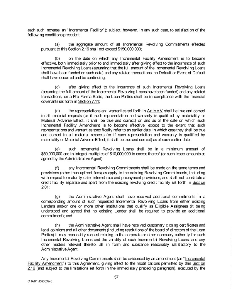 each such increase, an “Incremental Facility”); subject, however, in any such case, to satisfaction of the following conditions precedent: (a) the aggregate amount of all Incremental Revolving Commitments effected pursuant to this Section 2.16 shall not exceed $150,000,000; (b) on the date on which any Incremental Facility Amendment is to become effective, both immediately prior to and immediately after giving effect to the incurrence of such Incremental Revolving Loans (assuming that the full amount of the Incremental Revolving Loans shall have been funded on such date) and any related transactions, no Default or Event of Default shall have occurred and be continuing; (c) after giving effect to the incurrence of such Incremental Revolving Loans (assuming the full amount of the Incremental Revolving Loans have been funded) and any related transactions, on a Pro Forma Basis, the Loan Parties shall be in compliance with the financial covenants set forth in Section 7.11; (d) the representations and warranties set forth in Article V shall be true and correct in all material respects (or if such representation and warranty is qualified by materiality or Material Adverse Effect, it shall be true and correct) on and as of the date on which such Incremental Facility Amendment is to become effective, except to the extent that such representations and warranties specifically refer to an earlier date, in which case they shall be true and correct in all material respects (or if such representation and warranty is qualified by materiality or Material Adverse Effect, it shall be true and correct) as of such earlier date; (e) such Incremental Revolving Loans shall be in a minimum amount of $50,000,000 and in integral multiples of $10,000,000 in excess thereof (or such lesser amounts as agreed by the Administrative Agent); (f) any Incremental Revolving Commitments shall be made on the same terms and provisions (other than upfront fees) as apply to the existing Revolving Commitments, including with respect to maturity date, interest rate and prepayment provisions, and shall not constitute a credit facility separate and apart from the existing revolving credit facility set forth in Section 2.01; (g) the Administrative Agent shall have received additional commitments in a corresponding amount of such requested Incremental Revolving Loans from either existing Lenders and/or one or more other institutions that qualify as Eligible Assignees (it being understood and agreed that no existing Lender shall be required to provide an additional commitment); and (h) the Administrative Agent shall have received customary closing certificates and legal opinions and all other documents (including resolutions of the board of directors of the Loan Parties) it may reasonably request relating to the corporate or other necessary authority for such Incremental Revolving Loans and the validity of such Incremental Revolving Loans, and any other matters relevant thereto, all in form and substance reasonably satisfactory to the Administrative Agent. Any Incremental Revolving Commitments shall be evidenced by an amendment (an “Incremental Facility Amendment”) to this Agreement, giving effect to the modifications permitted by this Section 2.16 (and subject to the limitations set forth in the immediately preceding paragraph), executed by the 57 CHAR1\1593539v8