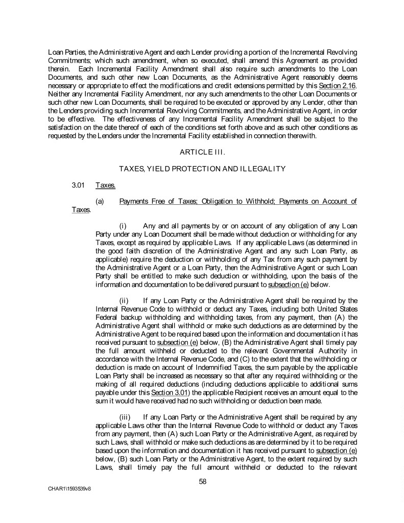 Loan Parties, the Administrative Agent and each Lender providing a portion of the Incremental Revolving Commitments; which such amendment, when so executed, shall amend this Agreement as provided therein. Each Incremental Facility Amendment shall also require such amendments to the Loan Documents, and such other new Loan Documents, as the Administrative Agent reasonably deems necessary or appropriate to effect the modifications and credit extensions permitted by this Section 2.16. Neither any Incremental Facility Amendment, nor any such amendments to the other Loan Documents or such other new Loan Documents, shall be required to be executed or approved by any Lender, other than the Lenders providing such Incremental Revolving Commitments, and the Administrative Agent, in order to be effective. The effectiveness of any Incremental Facility Amendment shall be subject to the satisfaction on the date thereof of each of the conditions set forth above and as such other conditions as requested by the Lenders under the Incremental Facility established in connection therewith. ARTICLE III. TAXES, YIELD PROTECTION AND ILLEGALITY 3.01 Taxes. (a) Payments Free of Taxes; Obligation to Withhold; Payments on Account of Taxes. (i) Any and all payments by or on account of any obligation of any Loan Party under any Loan Document shall be made without deduction or withholding for any Taxes, except as required by applicable Laws. If any applicable Laws (as determined in the good faith discretion of the Administrative Agent and any such Loan Party, as applicable) require the deduction or withholding of any Tax from any such payment by the Administrative Agent or a Loan Party, then the Administrative Agent or such Loan Party shall be entitled to make such deduction or withholding, upon the basis of the information and documentation to be delivered pursuant to subsection (e) below. (ii) If any Loan Party or the Administrative Agent shall be required by the Internal Revenue Code to withhold or deduct any Taxes, including both United States Federal backup withholding and withholding taxes, from any payment, then (A) the Administrative Agent shall withhold or make such deductions as are determined by the Administrative Agent to be required based upon the information and documentation it has received pursuant to subsection (e) below, (B) the Administrative Agent shall timely pay the full amount withheld or deducted to the relevant Governmental Authority in accordance with the Internal Revenue Code, and (C) to the extent that the withholding or deduction is made on account of Indemnified Taxes, the sum payable by the applicable Loan Party shall be increased as necessary so that after any required withholding or the making of all required deductions (including deductions applicable to additional sums payable under this Section 3.01) the applicable Recipient receives an amount equal to the sum it would have received had no such withholding or deduction been made. (iii) If any Loan Party or the Administrative Agent shall be required by any applicable Laws other than the Internal Revenue Code to withhold or deduct any Taxes from any payment, then (A) such Loan Party or the Administrative Agent, as required by such Laws, shall withhold or make such deductions as are determined by it to be required based upon the information and documentation it has received pursuant to subsection (e) below, (B) such Loan Party or the Administrative Agent, to the extent required by such Laws, shall timely pay the full amount withheld or deducted to the relevant 58 CHAR1\1593539v8
