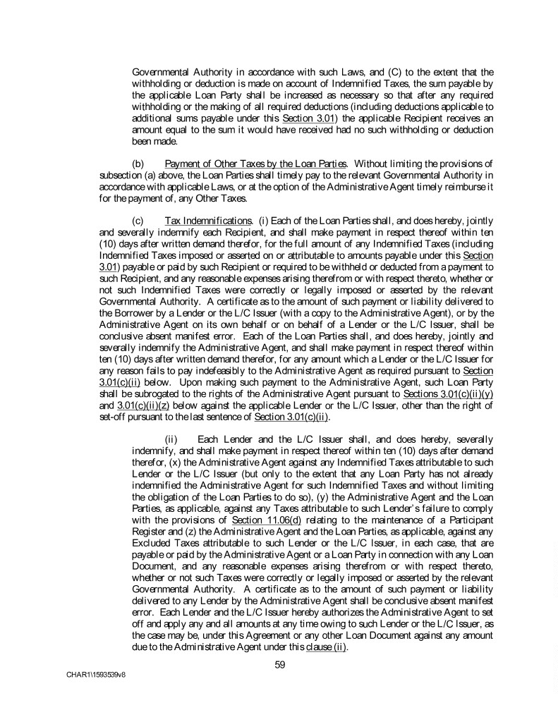 Governmental Authority in accordance with such Laws, and (C) to the extent that the withholding or deduction is made on account of Indemnified Taxes, the sum payable by the applicable Loan Party shall be increased as necessary so that after any required withholding or the making of all required deductions (including deductions applicable to additional sums payable under this Section 3.01) the applicable Recipient receives an amount equal to the sum it would have received had no such withholding or deduction been made. (b) Payment of Other Taxes by the Loan Parties. Without limiting the provisions of subsection (a) above, the Loan Parties shall timely pay to the relevant Governmental Authority in accordance with applicable Laws, or at the option of the Administrative Agent timely reimburse it for the payment of, any Other Taxes. (c) Tax Indemnifications. (i) Each of the Loan Parties shall, and does hereby, jointly and severally indemnify each Recipient, and shall make payment in respect thereof within ten (10) days after written demand therefor, for the full amount of any Indemnified Taxes (including Indemnified Taxes imposed or asserted on or attributable to amounts payable under this Section 3.01) payable or paid by such Recipient or required to be withheld or deducted from a payment to such Recipient, and any reasonable expenses arising therefrom or with respect thereto, whether or not such Indemnified Taxes were correctly or legally imposed or asserted by the relevant Governmental Authority. A certificate as to the amount of such payment or liability delivered to the Borrower by a Lender or the L/C Issuer (with a copy to the Administrative Agent), or by the Administrative Agent on its own behalf or on behalf of a Lender or the L/C Issuer, shall be conclusive absent manifest error. Each of the Loan Parties shall, and does hereby, jointly and severally indemnify the Administrative Agent, and shall make payment in respect thereof within ten (10) days after written demand therefor, for any amount which a Lender or the L/C Issuer for any reason fails to pay indefeasibly to the Administrative Agent as required pursuant to Section 3.01(c)(ii) below. Upon making such payment to the Administrative Agent, such Loan Party shall be subrogated to the rights of the Administrative Agent pursuant to Sections 3.01(c)(ii)(y) and 3.01(c)(ii)(z) below against the applicable Lender or the L/C Issuer, other than the right of set-off pursuant to the last sentence of Section 3.01(c)(ii). (ii) Each Lender and the L/C Issuer shall, and does hereby, severally indemnify, and shall make payment in respect thereof within ten (10) days after demand therefor, (x) the Administrative Agent against any Indemnified Taxes attributable to such Lender or the L/C Issuer (but only to the extent that any Loan Party has not already indemnified the Administrative Agent for such Indemnified Taxes and without limiting the obligation of the Loan Parties to do so), (y) the Administrative Agent and the Loan Parties, as applicable, against any Taxes attributable to such Lender’s failure to comply with the provisions of Section 11.06(d) relating to the maintenance of a Participant Register and (z) the Administrative Agent and the Loan Parties, as applicable, against any Excluded Taxes attributable to such Lender or the L/C Issuer, in each case, that are payable or paid by the Administrative Agent or a Loan Party in connection with any Loan Document, and any reasonable expenses arising therefrom or with respect thereto, whether or not such Taxes were correctly or legally imposed or asserted by the relevant Governmental Authority. A certificate as to the amount of such payment or liability delivered to any Lender by the Administrative Agent shall be conclusive absent manifest error. Each Lender and the L/C Issuer hereby authorizes the Administrative Agent to set off and apply any and all amounts at any time owing to such Lender or the L/C Issuer, as the case may be, under this Agreement or any other Loan Document against any amount due to the Administrative Agent under this clause (ii). 59 CHAR1\1593539v8