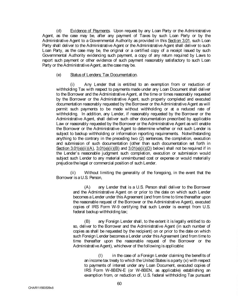 (d) Evidence of Payments. Upon request by any Loan Party or the Administrative Agent, as the case may be, after any payment of Taxes by such Loan Party or by the Administrative Agent to a Governmental Authority as provided in this Section 3.01, such Loan Party shall deliver to the Administrative Agent or the Administrative Agent shall deliver to such Loan Party, as the case may be, the original or a certified copy of a receipt issued by such Governmental Authority evidencing such payment, a copy of any return required by Laws to report such payment or other evidence of such payment reasonably satisfactory to such Loan Party or the Administrative Agent, as the case may be. (e) Status of Lenders; Tax Documentation. (i) Any Lender that is entitled to an exemption from or reduction of withholding Tax with respect to payments made under any Loan Document shall deliver to the Borrower and the Administrative Agent, at the time or times reasonably requested by the Borrower or the Administrative Agent, such properly completed and executed documentation reasonably requested by the Borrower or the Administrative Agent as will permit such payments to be made without withholding or at a reduced rate of withholding. In addition, any Lender, if reasonably requested by the Borrower or the Administrative Agent, shall deliver such other documentation prescribed by applicable Law or reasonably requested by the Borrower or the Administrative Agent as will enable the Borrower or the Administrative Agent to determine whether or not such Lender is subject to backup withholding or information reporting requirements. Notwithstanding anything to the contrary in the preceding two (2) sentences, the completion, execution and submission of such documentation (other than such documentation set forth in Section 3.01(e)(ii)(A), 3.01(e)(ii)(B) and 3.01(e)(ii)(D) below) shall not be required if in the Lender’s reasonable judgment such completion, execution or submission would subject such Lender to any material unreimbursed cost or expense or would materially prejudice the legal or commercial position of such Lender. (ii) Without limiting the generality of the foregoing, in the event that the Borrower is a U.S. Person, (A) any Lender that is a U.S. Person shall deliver to the Borrower and the Administrative Agent on or prior to the date on which such Lender becomes a Lender under this Agreement (and from time to time thereafter upon the reasonable request of the Borrower or the Administrative Agent), executed copies of IRS Form W-9 certifying that such Lender is exempt from U.S. federal backup withholding tax; (B) any Foreign Lender shall, to the extent it is legally entitled to do so, deliver to the Borrower and the Administrative Agent (in such number of copies as shall be requested by the recipient) on or prior to the date on which such Foreign Lender becomes a Lender under this Agreement (and from time to time thereafter upon the reasonable request of the Borrower or the Administrative Agent), whichever of the following is applicable: (I) in the case of a Foreign Lender claiming the benefits of an income tax treaty to which the United States is a party (x) with respect to payments of interest under any Loan Document, executed copies of IRS Form W-8BEN-E (or W-8BEN, as applicable) establishing an exemption from, or reduction of, U.S. federal withholding Tax pursuant 60 CHAR1\1593539v8