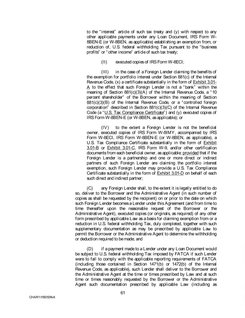 to the “interest” article of such tax treaty and (y) with respect to any other applicable payments under any Loan Document, IRS Form W- 8BEN-E (or W-8BEN, as applicable) establishing an exemption from, or reduction of, U.S. federal withholding Tax pursuant to the “business profits” or “other income” article of such tax treaty; (II) executed copies of IRS Form W-8ECI; (III) in the case of a Foreign Lender claiming the benefits of the exemption for portfolio interest under Section 881(c) of the Internal Revenue Code, (x) a certificate substantially in the form of Exhibit 3.01- A to the effect that such Foreign Lender is not a “bank” within the meaning of Section 881(c)(3)(A) of the Internal Revenue Code, a “10 percent shareholder” of the Borrower within the meaning of Section 881(c)(3)(B) of the Internal Revenue Code, or a “controlled foreign corporation” described in Section 881(c)(3)(C) of the Internal Revenue Code (a “U.S. Tax Compliance Certificate”) and (y) executed copies of IRS Form W-8BEN-E (or W-8BEN, as applicable); or (IV) to the extent a Foreign Lender is not the beneficial owner, executed copies of IRS Form W-8IMY, accompanied by IRS Form W-8ECI, IRS Form W-8BEN-E (or W-8BEN, as applicable), a U.S. Tax Compliance Certificate substantially in the form of Exhibit 3.01-B or Exhibit 3.01-C, IRS Form W-9, and/or other certification documents from each beneficial owner, as applicable; provided that if the Foreign Lender is a partnership and one or more direct or indirect partners of such Foreign Lender are claiming the portfolio interest exemption, such Foreign Lender may provide a U.S. Tax Compliance Certificate substantially in the form of Exhibit 3.01-D on behalf of each such direct and indirect partner; (C) any Foreign Lender shall, to the extent it is legally entitled to do so, deliver to the Borrower and the Administrative Agent (in such number of copies as shall be requested by the recipient) on or prior to the date on which such Foreign Lender becomes a Lender under this Agreement (and from time to time thereafter upon the reasonable request of the Borrower or the Administrative Agent), executed copies (or originals, as required) of any other form prescribed by applicable Law as a basis for claiming exemption from or a reduction in U.S. federal withholding Tax, duly completed, together with such supplementary documentation as may be prescribed by applicable Law to permit the Borrower or the Administrative Agent to determine the withholding or deduction required to be made; and (D) if a payment made to a Lender under any Loan Document would be subject to U.S. federal withholding Tax imposed by FATCA if such Lender were to fail to comply with the applicable reporting requirements of FATCA (including those contained in Section 1471(b) or 1472(b) of the Internal Revenue Code, as applicable), such Lender shall deliver to the Borrower and the Administrative Agent at the time or times prescribed by Law and at such time or times reasonably requested by the Borrower or the Administrative Agent such documentation prescribed by applicable Law (including as 61 CHAR1\1593539v8